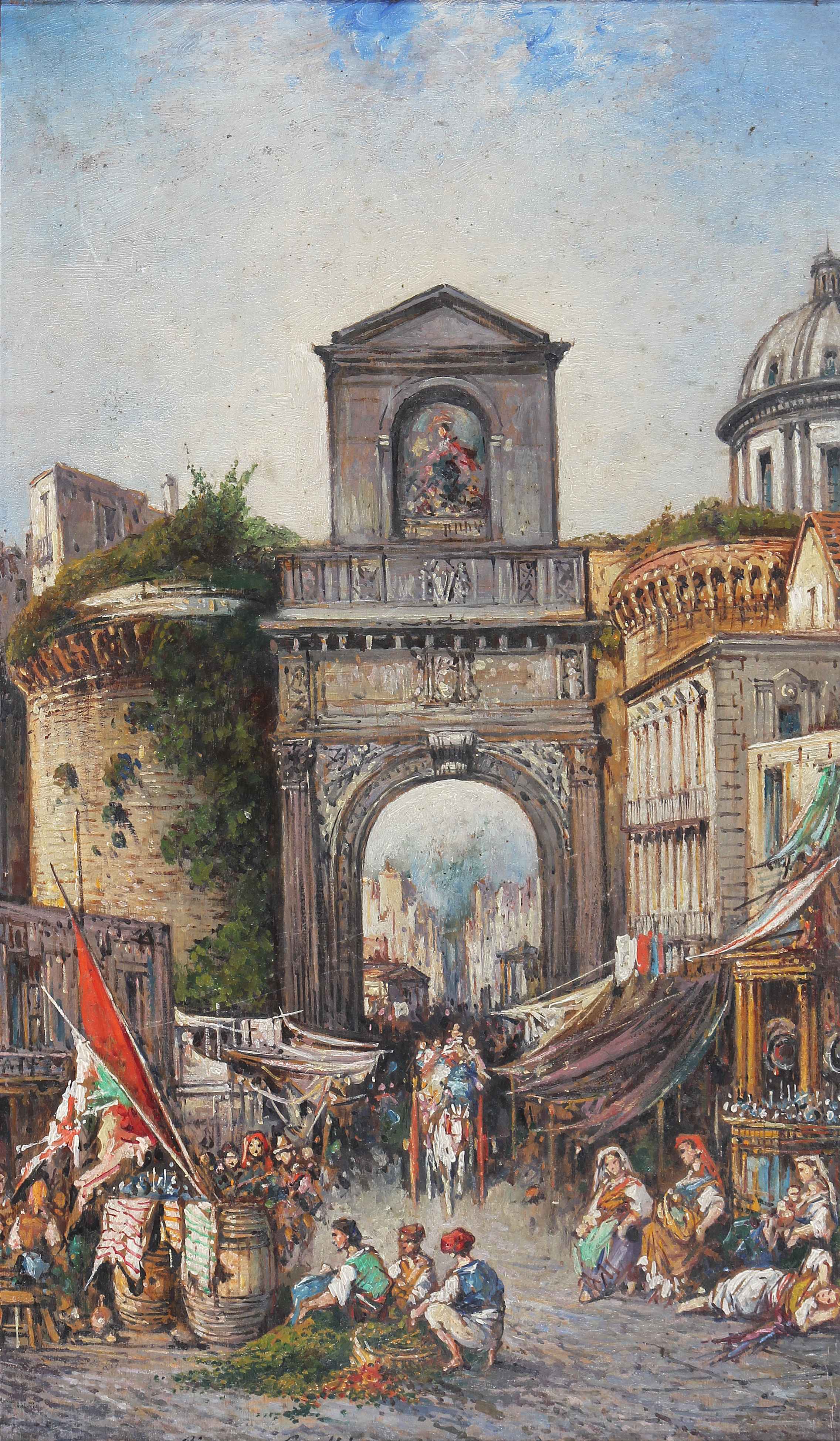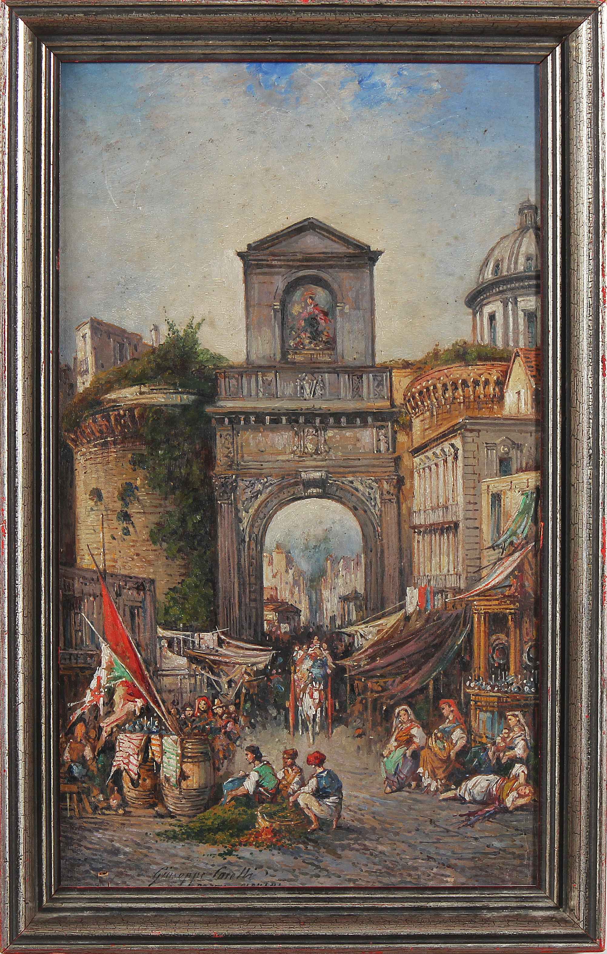 CARELLI GIUSEPPE (1858 - 1921) Mercato di Porta Capuana. Olio su cartone. Cm 25,00 x 43,00. Firma in basso. CARELLI GIUSEPPE (1858 - 1921) Porta Capuana Market. Oil on cardboard Signature on the bottom. 25,00 x 43,00 cm. Cornice presente