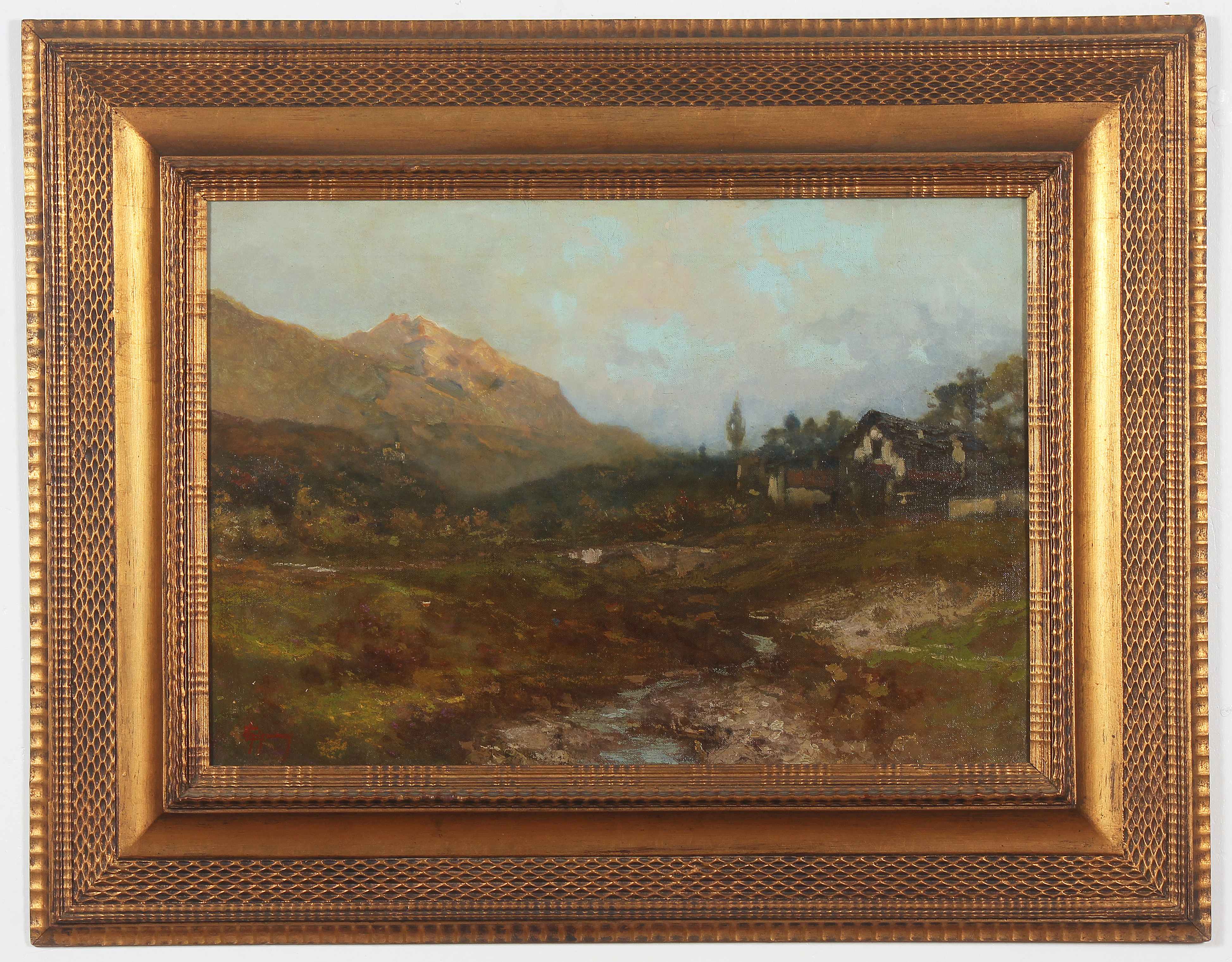 GIGNOUS LORENZO (1862 - 1958) Paesaggio montano. Olio su tela . Cm 65,00 x 50,00. Firma in basso a sinistra. Al retro cartiglio della Galleria Bolzani, Milano. GIGNOUS LORENZO (1862 - 1958) Mountain Landscape. Oil on canvas Signature on the bottom left. A cartouche for the Galleria Bolzani, Milan, is on the back. 65,00 x 50,00 cm. Cornice presente