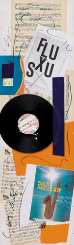 GIUSEPPE CHIARI Firenze 26/09/1926 - Firenze 10/05/2007 Sax melody, anni 2000 disco, tecnica mista e collage su tavola cm. 108x33, firma in basso a sinistra, opera registrata presso l'Archivio Giuseppe e Victoria Chiari come da dichiarazione su foto