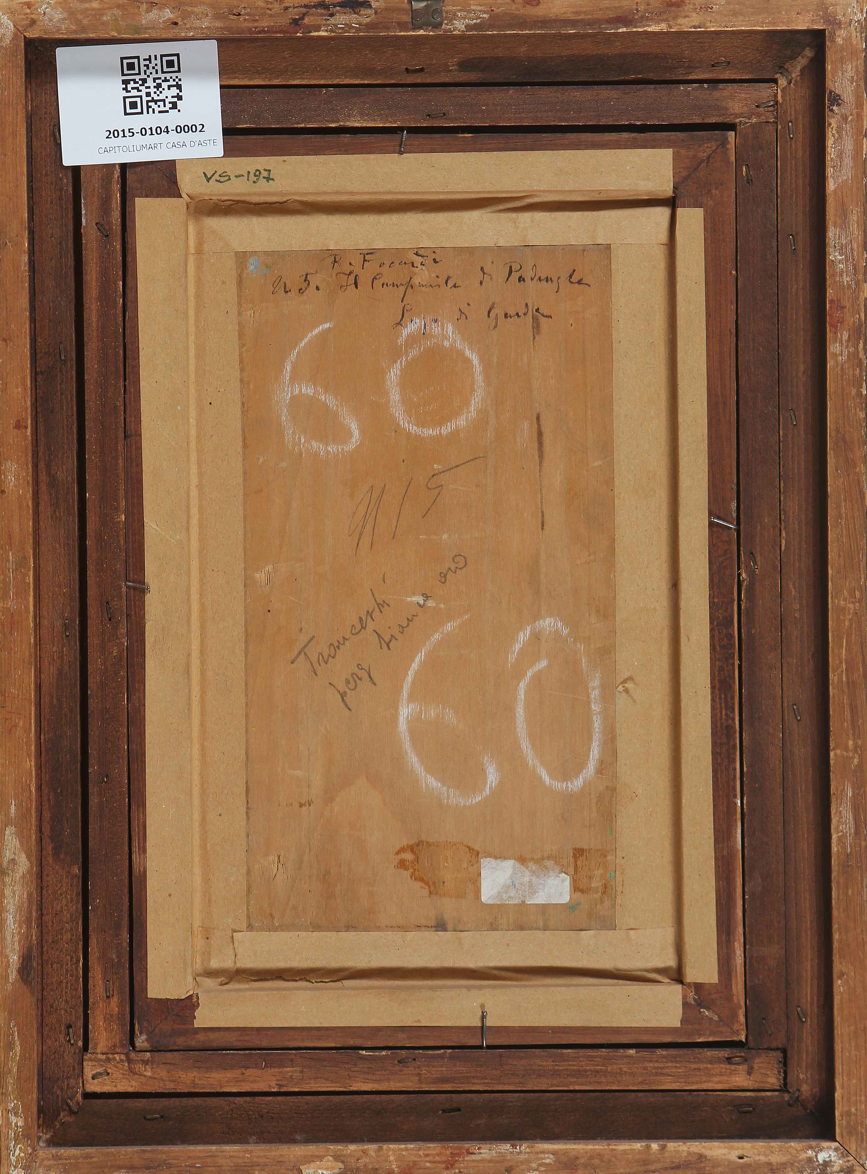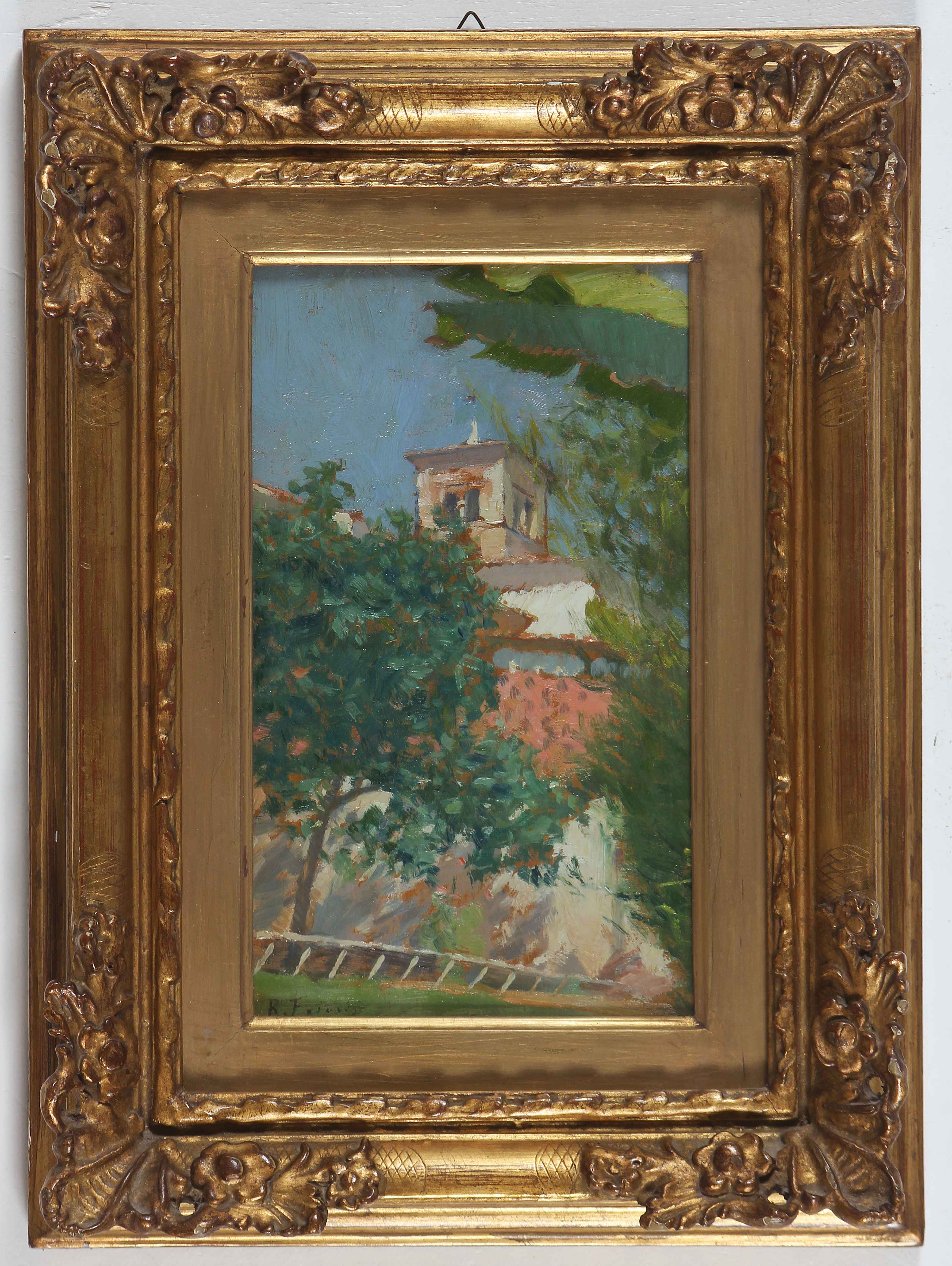 FOCARDI PIERO (1889 - 1945) Il campanile di Padenghe. Lago di Garda. Olio su tavola. Cm 23,00 x 31,00. Firmato in basso a sinistra. Titolo e firma al retro. FOCARDI PIERO (1889 - 1945) The Bell Tower of Padenghe. Lake Garda Oil on panel Signed on the lower left. Title and signature on the back. 23,00 x 31,00 cm. . Cornice presente