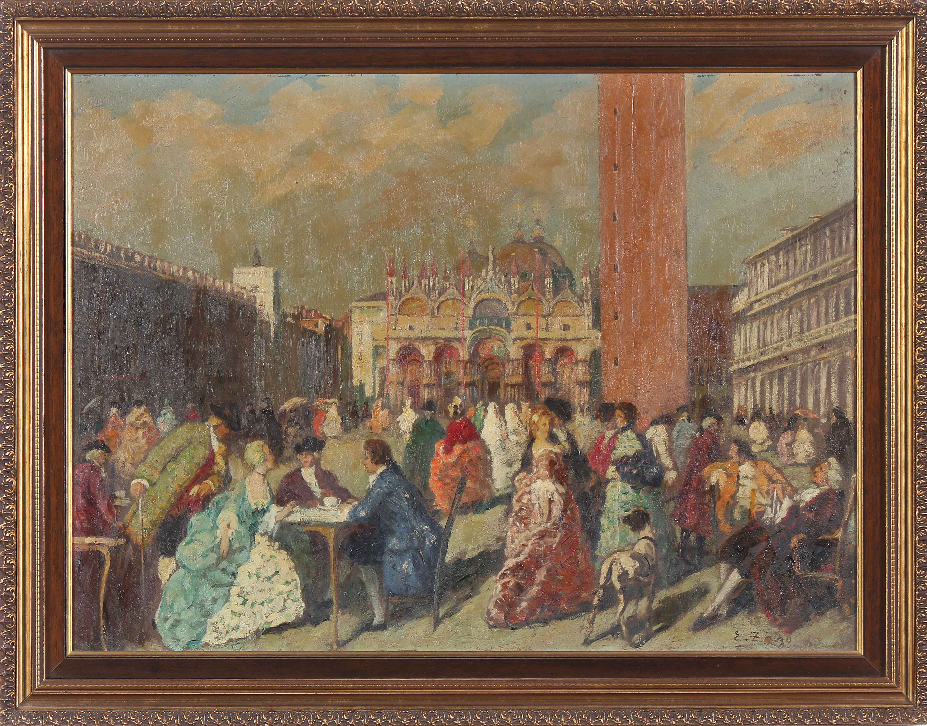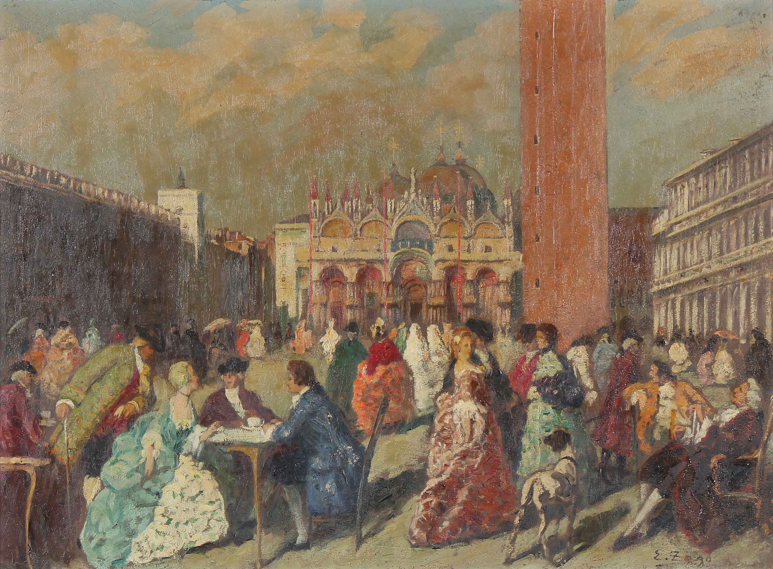 ZAGO ERMA (1880 - 1942) Piazza San Marco in festa. Olio su tavola. Cm 60,00 x 44,00. Firma in basso a destra. ZAGO ERMA (1880 - 1942) Piazza San Marco During a Celebration. Oil on panel Signature on the bottom right. 60,00 x 44,00 cm. . Cornice presente