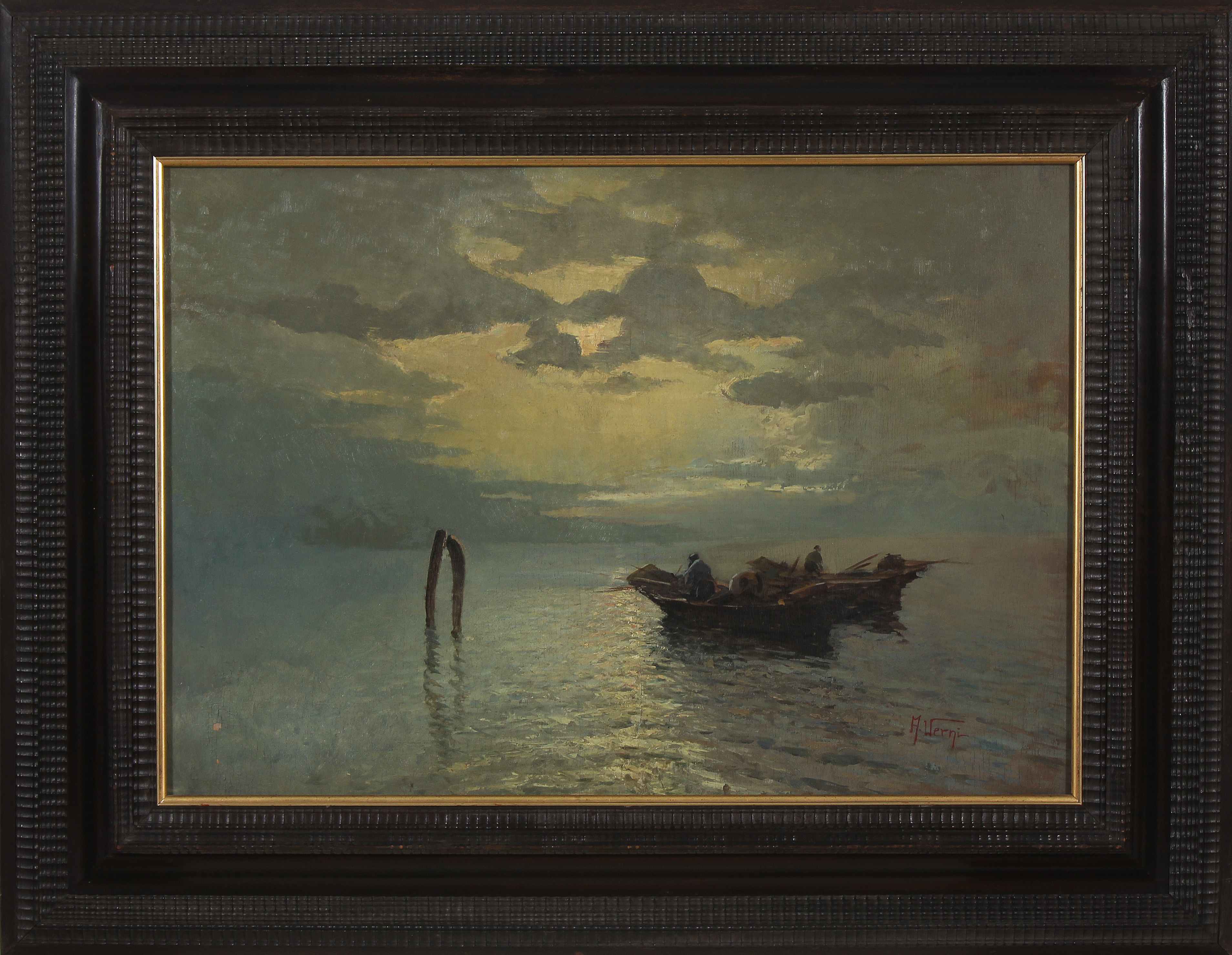 VERNI ARTURO (1891 - 1960) Marina a Venezia. Olio su tavola. Cm 100,00 x 70,00. Firma in basso a sinistra. Bella cornice coeva. Anni '20. Provenienza: Galleria D'Arte Arnaldo, Brescia; collezione privata, Brescia. VERNI ARTURO (1891 - 1960) Marina in Venice. Oil on panel Signature on the bottom left. Beautiful coeval frame. 1920s. Providence: Galleria D'Arte Arnaldo, Brescia; private collection, Brescia. 100,00 x 70,00 cm.