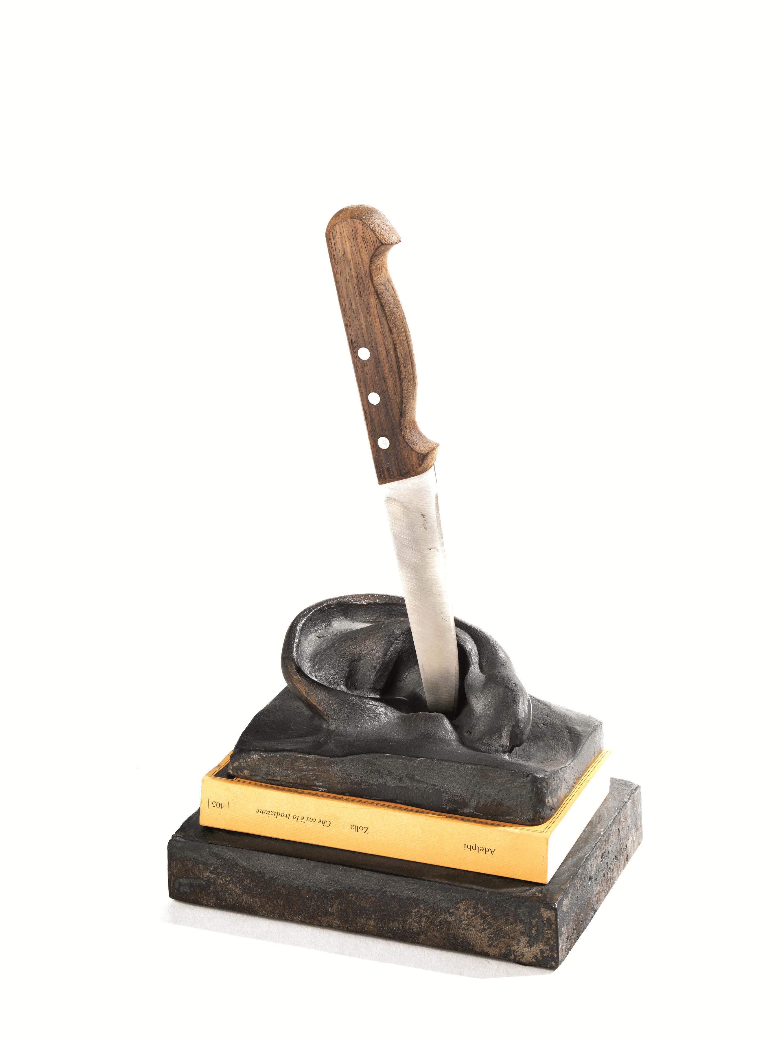calco di orecchio in piombo, coltello e ferro, cm 34x20x14