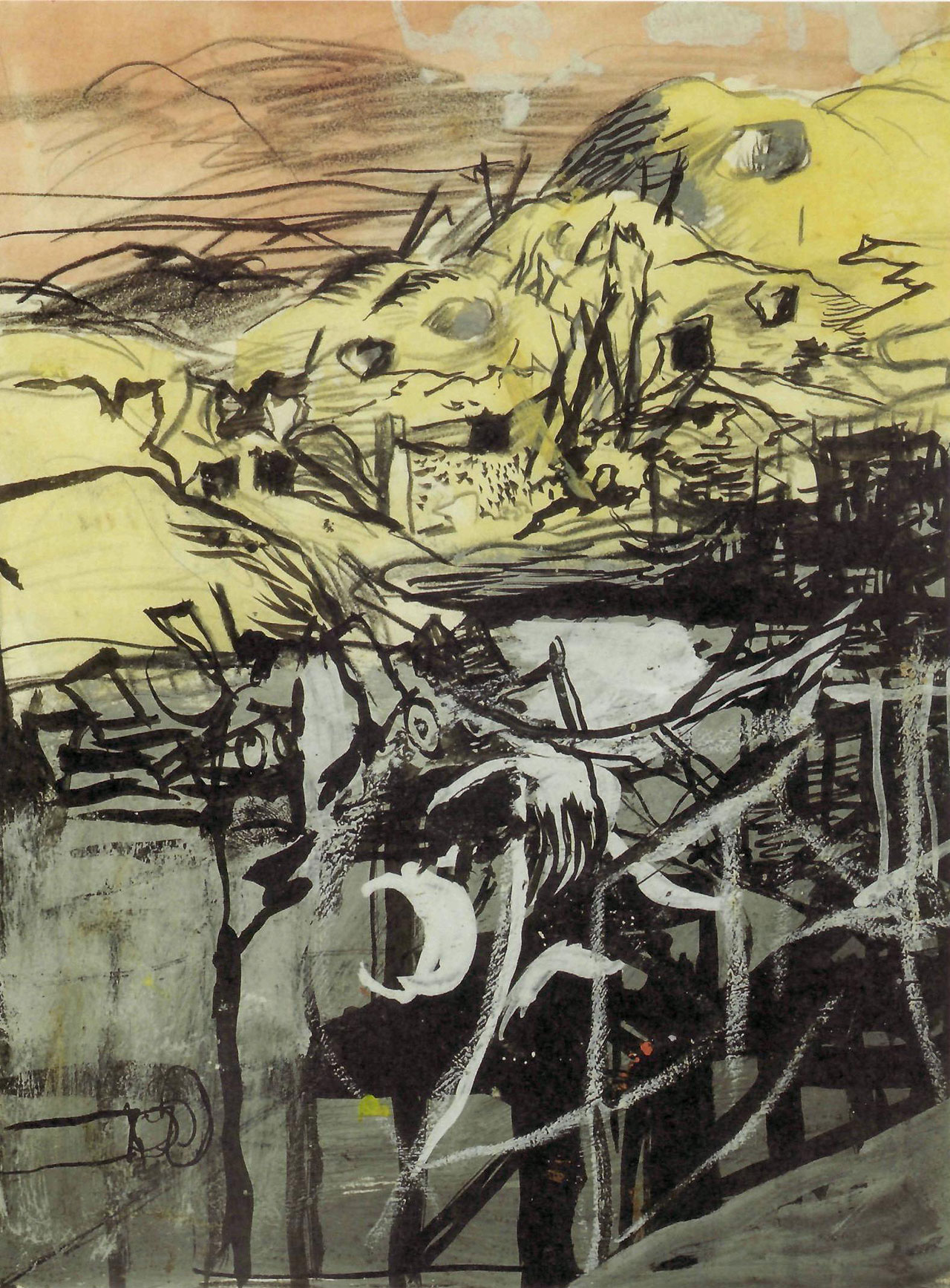 Graham Sutherland London/Londra 1903 - 1980 Hills above bomb storage caves pierced by bomb St. Leu d'Esserent, France, 1945 Inchiostro, matita, gouache su carta, 20,2x17 cm Provenienza: direttamente dallo Studio dell’artista; collezione privata, Milano Esposizioni: Genova, Accademia Ligustica, 1991; Milano, Palazzo della Permanente, 2011; Parma - Mamiano di Traversetolo, Fondazione Magnani Rocca, 2012 Bibliografia: G. Bruno, Graham Sutherland, storia segreta: 1922-1979, cat. della mostra, Accademia Ligustica, Genova, 26 ottobre 1991-11 gennaio 1992, Colombo, Genova 1991, n. 94, p. 83; Graham Sutherland. Disegni dalla città in fiamme, cat. della mostra a cura di R. Ferrario, A. Ghinzani, Museo della Permanente, Milano 16 novembre 2011-8 gennaio 2012, Skira Editore, Milano 2011, p. 61, illustrato a colori; Sutherland. Il pittore che smascherò la natura, cat. della mostra a cura di S. Roffi, Fondazione Magnani Rocca, Parma - Mamiano di Traversetolo, 8 settembre-9 dicembre 2012, Silvana Editoriale, Cinisello Balsamo 2012, p. 95, illustrato a colori