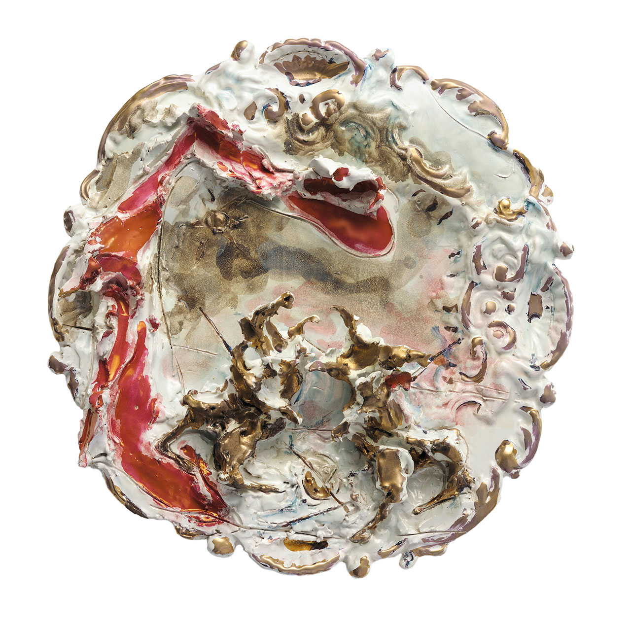 Lucio Fontana Rosario di Santa Fè 1899 - Varese 1968 Battaglia, 1949 Ceramica smaltata, 50 cm ø Al retro: firmata e datata “L. Fontana 49”; timbro Manifattura Fenice, Albissola Provenienza: già collezione Carlo Signorini, Ravenna; collezione privata L’opera è archiviata presso la Fondazione Lucio Fontana, Milano, con numero d’archivio 942/1