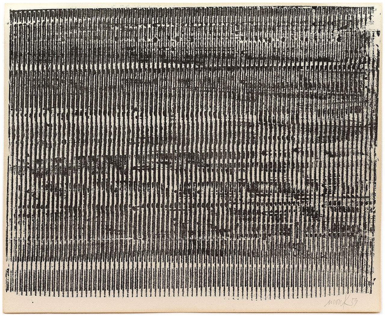 Heinz Mack Lollar, 1931 Senza titolo (La Lune en Rodage), 1959 Frottage, 20x24 cm Firmato e datato in basso a destra: “Mack 59” Provenienza: collezione privata Esposizioni: Marcon (Venezia), Padiglione delle Arti, 2014 Bibliografia: Around Zero, cat. della mostra a cura di L. Beatrice, W. Montini, Padiglione delle Arti, Marcon (Venezia) 10 ottobre – 30 novembre 2014, Silvana Editoriale, Cinisello Balsamo 2014, p. 94, illustrato a colori
