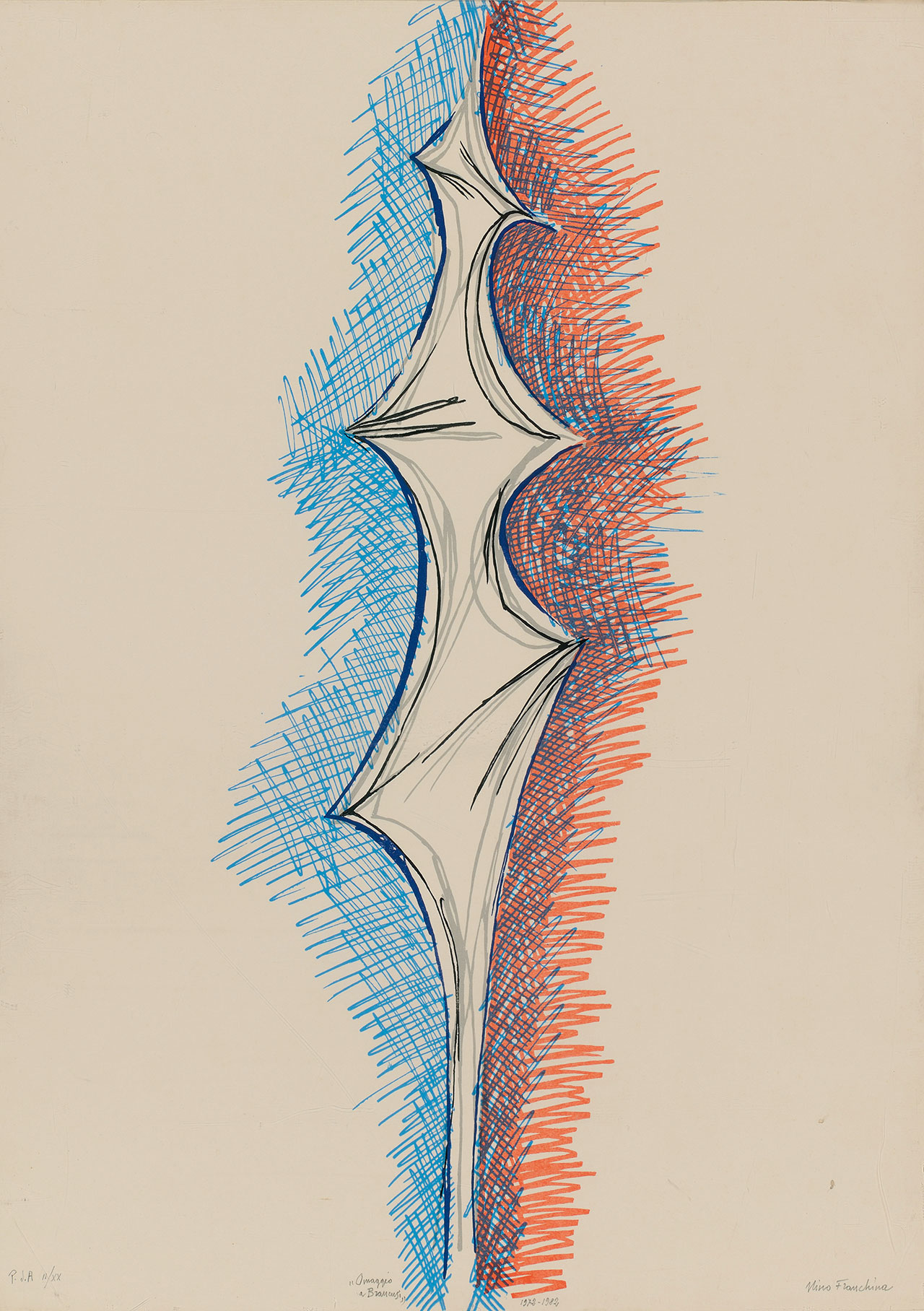 Nino Franchina Palmanova 1912 - Rom/Roma 1987 Omaggio a Brancusi, 1972-1982 Serigrafia, 68,5x49 cm Edizione: prova d’artista n. 2/20 Firmata in basso a destra: “Nino Franchina” Intitolata in basso al centro: “Omaggio a Brancusi 1972-1982” Numerata in basso a sinistra: “P.d.A. II/XX” Al retro: etichetta della Galleria Editalia, Roma Provenienza: già collezione Piero Luigi Siena, Bolzano; collezione privata