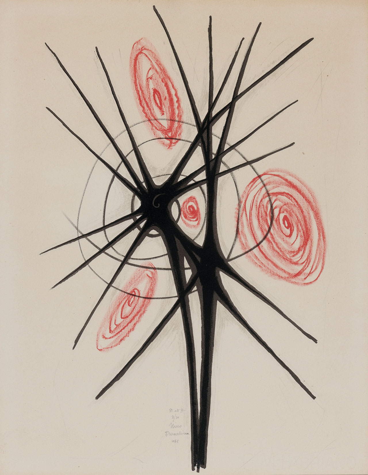 Nino Franchina Palmanova 1912 - Rom/Roma 1987 Ritmo di forme, 1955 Litografia, 48x37,5 cm Edizione: n. 3/10 Numerata, firmata e datata in basso al centro: “St. all’A. 3/10 Nino Franchina 1955” Al retro: Etichetta dell’Esposizione “Selezione d’arte Europea”, Livorno 1958 Provenienza: già collezione Piero Luigi Siena, Bolzano; collezione privata Esposizioni: Livorno, Casa Comunale della Cultura, 1958 Bibliografia: Selezione d’arte Europea, cat. della mostra, Casa Comunale della Cultura, Livorno, 15-29 maggio 1958, n. 42