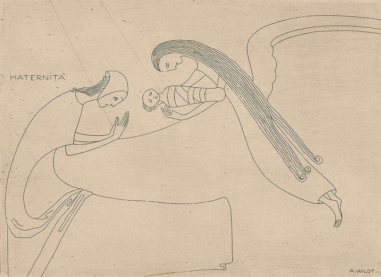Adolfo Wildt Mailand/Milano 1868 - 1931 Maternità Puntasecca, 19x26,4 cm Firmata in basso a destra: “A. Wildt” Al retro: etichetta Antiquariato Cancello, Novara