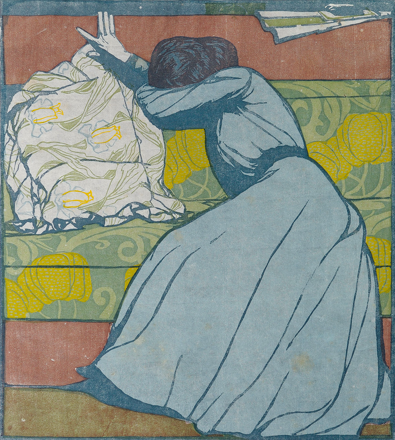 Maximilian Kurzweil Bisenz bei Ungarisch-Hradisch 1867 - Wien/Vienna 1916 Il cuscino, 1910 Xilografia a colori su carta di riso, 28,5x25,5 cm Firmata e datata sul Passepartout: “Maximilian Kurzweil 1910” Provenienza: collezione privata
