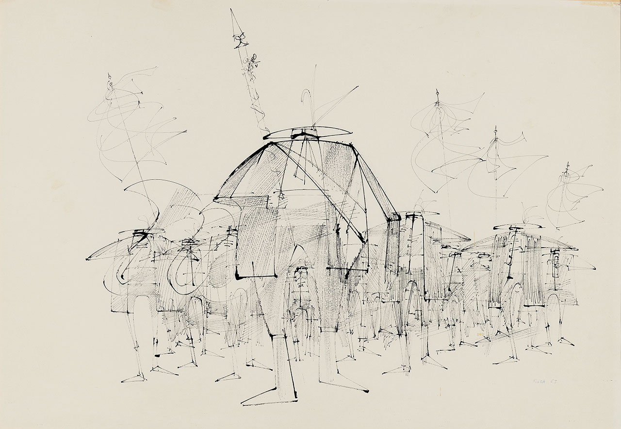 Paul Flora Glurns/Glorenza 1929 - Innsbruck 2009 Die Musikappelle, 1963 China su carta, 40,5 x 59 cm Firmato e datato in basso a destra: “Flora 63” Provenienza: collezione privata