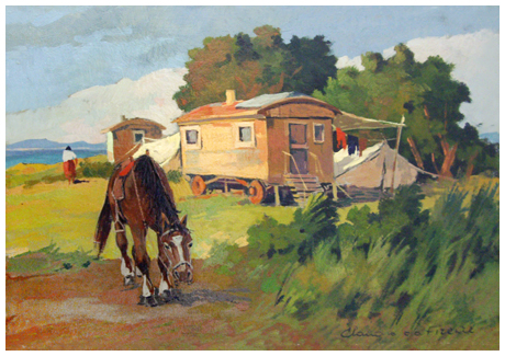 CLAUDIO DA FIRENZE (Claudio Domenici) Firenze 1943 Accampamento di zingari Olio su faesite 35 x 50. Firma in b. a d.; sul verso firma e titolo.