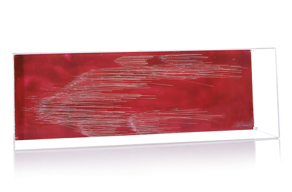 scultura in vetro su fondo rosso cm. 31x91,5x17, firma e anno in basso a destra, entro teca in plexiglass, dichiarazione d'autenticità dell'artista su stampa fotografica A4 allegata.