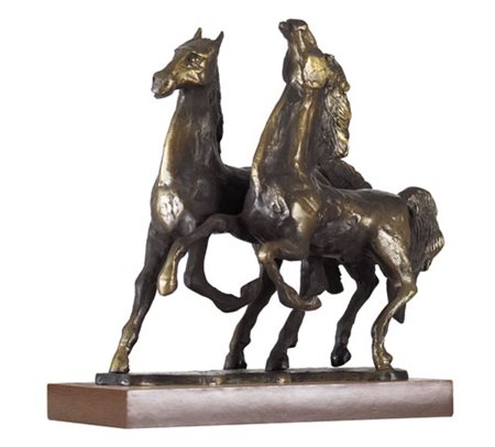 GIANRIGO Venezia 1922 Cavalli scultura in bronzo poggiante su base in legno cm. 13x23 altezza cm. 27, esemplare 95/150, firma alla base, certificato d'autenticità della SpiraleArte (MI) allegato.