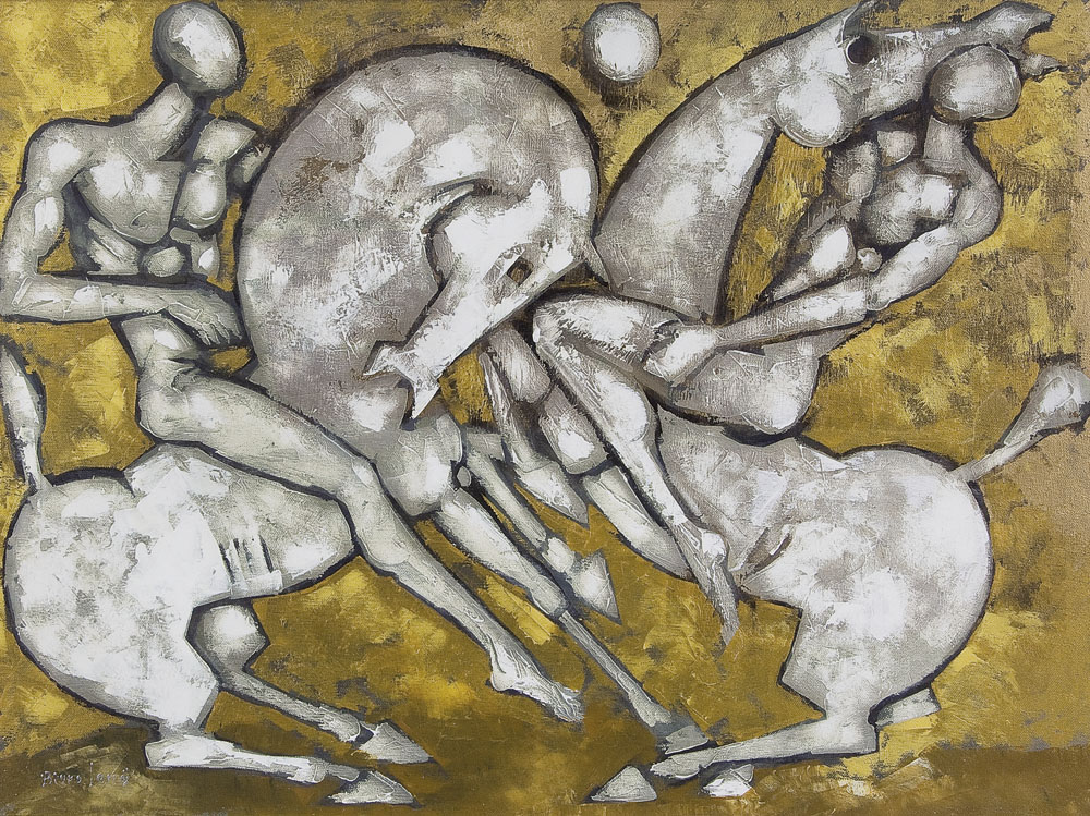 LANDI BRUNO Roma 23/03/1941Il duello, 2002olio su tela cm. 60x80, firma in...
