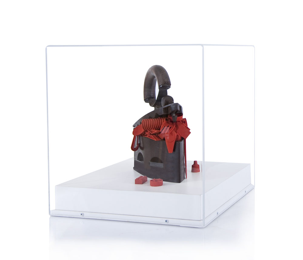 scultura in materiali vari e colore acrilico cm. 26x33x33; firma e titolo sotto la base, dichiarazione d'autenticità dell'artista su foto, entro teca in plexiglass.
