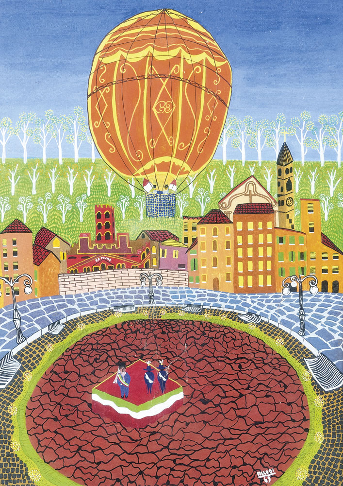 ALLODI LUCIANO 1938La mongolfiera, 1969tempera su tela cm. 70x50, firma e...