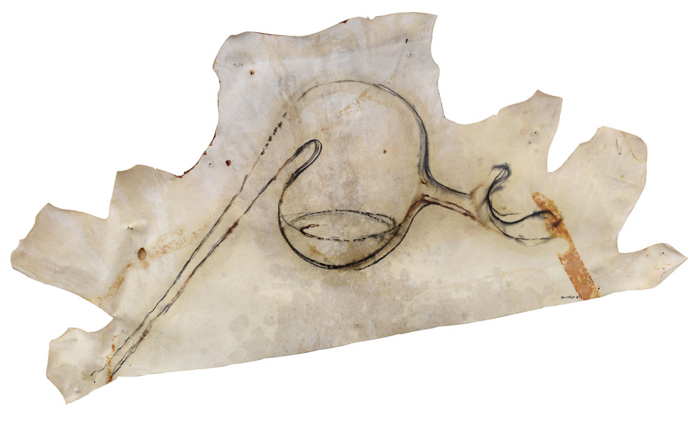 inchiostri su pergamena applicata su tavola cm. 70,5x137,5; firma e anno in basso a destra sulla pergamena, dichiarazione d'autenticità dell'artista su foto, entro teca in plexiglass.
