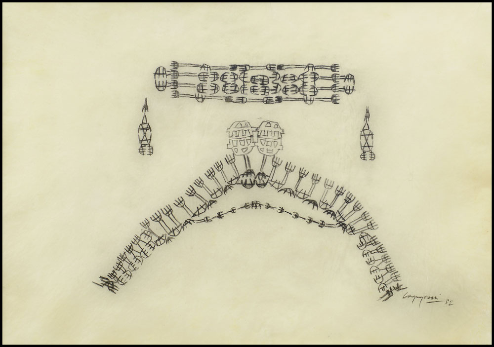 disegno per gioielli a matita grassa nera su carta cm. 42,5x61,8; firma e anno in basso a destra, etichetta e timbro della Galleria Artecentro (MI) al retro, opera registrata presso l'Archivio Giuseppe Capogrossi al n° AC/269/D come da dichiarazione su foto.