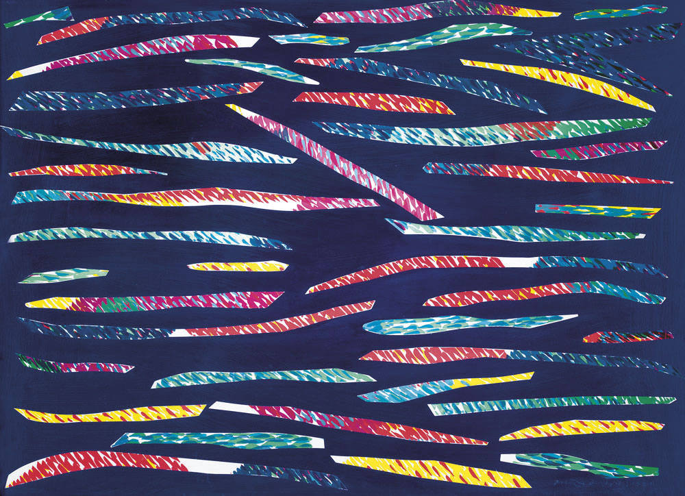 tempera su carta a mano intelata con collage di frammenti serigrafati cm. 76x105, firma e anno in basso a destra, lettera di conferma dell'autenticità a cura di Federico Sardella dell'Archivio Opera Piero Dorazio allegata.