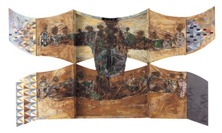 olio e collage su legno con parti richiudibili cm. 133,5x172x14 aperto (133,5x92x14 chiuso), firma, titolo, anno ed etichetta della mostra tenutasi presso la Galerie Hadrien Thomas (Paris) dal 19 marzo al 16 maggio 1992 al retro, dichiarazione d'autenticità e archivio dell'artista su foto, opera senza cornice.
