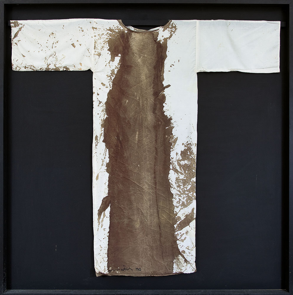 sangue e tecnica mista su stoffa (tunica della performance in Graz) cm. 170x155, firma e anno in basso, dichiarazione d'autenticità dell'artista e timbro della O.M. Theater su foto.