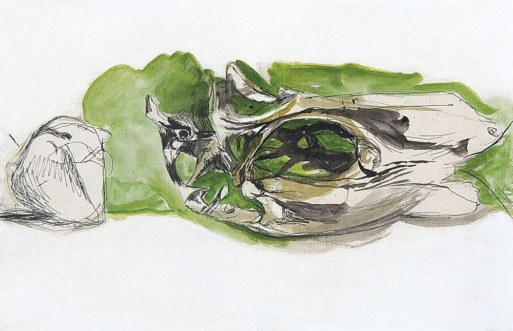 china, matita e acquerello su carta applicata su tela cm. 22,7x35,1; opera non firmata, registrata presso l'Archivio delle Opere di Graham Sutherland al n° 46694 come da dichiarazione della Galleria Ruggerini & Zonca (MI) su foto.