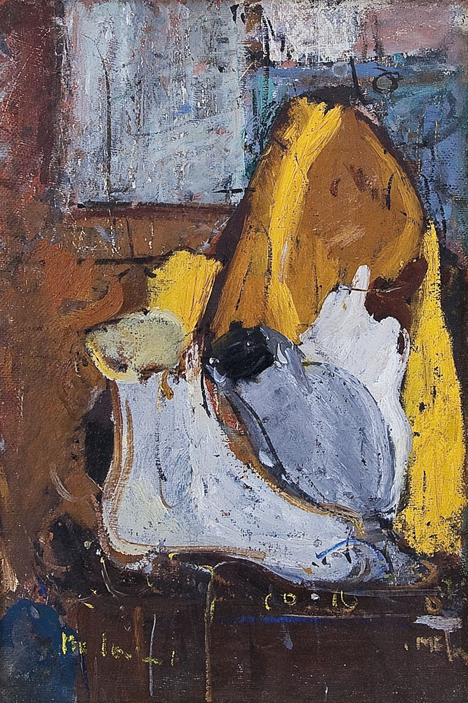 olio su tela cm. 67,5x45,5; firma in basso a destra ed in basso a sinistra, anno, firma, etichette della Galleria Il Chiostro (Saronno-VA) e della Galleria Cafiso (MI), timbri della Galleria Del Milione (MI) e della Galleria Il Chiostro (Saronno-VA) al retro.