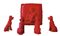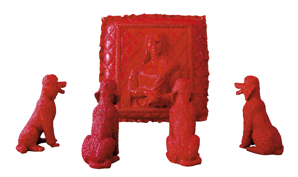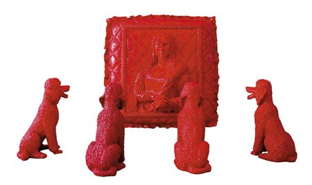 installazione di 5 sculture in resine, plastiche e smalti composta da 1 cuscino con ritratto di Mona Lisa cm. 125x125x50 + 4 barboncini cm. 60x40x20 cadauno, opera non firmata.