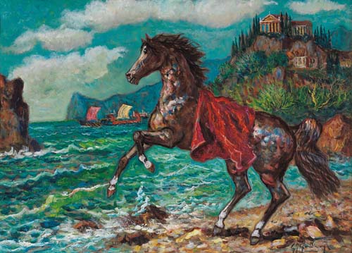 GIOVANFRANCESCO GONZAGA Milano 12/06/1921 - Milano 02/10/2007 Il corsiero di Giasone, (1995) olio su tela cm. 50x70, firma in basso a destra, firma, titolo e timbro con archivio AC 2132 al retro, autentica dell'artista e archivio numero Ac 2132 a cura della Galleria D'Arte Il Salotto (MI) su foto, opera pubblicata sul catalogo della Mostra Antologica Giovan Francesco Gonzaga tenutasi dal 23 maggio al 14 Giugno 2009 presso la Meeting Art (VC) in occasione dei 30 anni a pagina 41