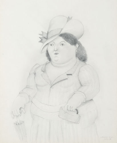 FERNANDO BOTERO Medellin (Colombia) 19/04/1932 Mujer con Paraguas, 1983 matita su carta cm. 43,6x35,3; firma, anno e dedica dell'artista ad personam in basso a destra, etichetta e firma per autenticità e provenienza della Galleria Marlborough (New York) su foto.