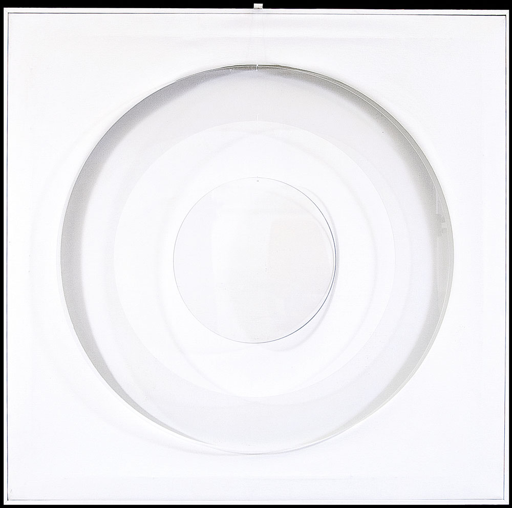 disco e cerchio in plexiglass sospesi a cornice in legno cm. 82,5x82x5; trattenente tela bianca con foro circolare al centro, firma, titolo e anno al retro.