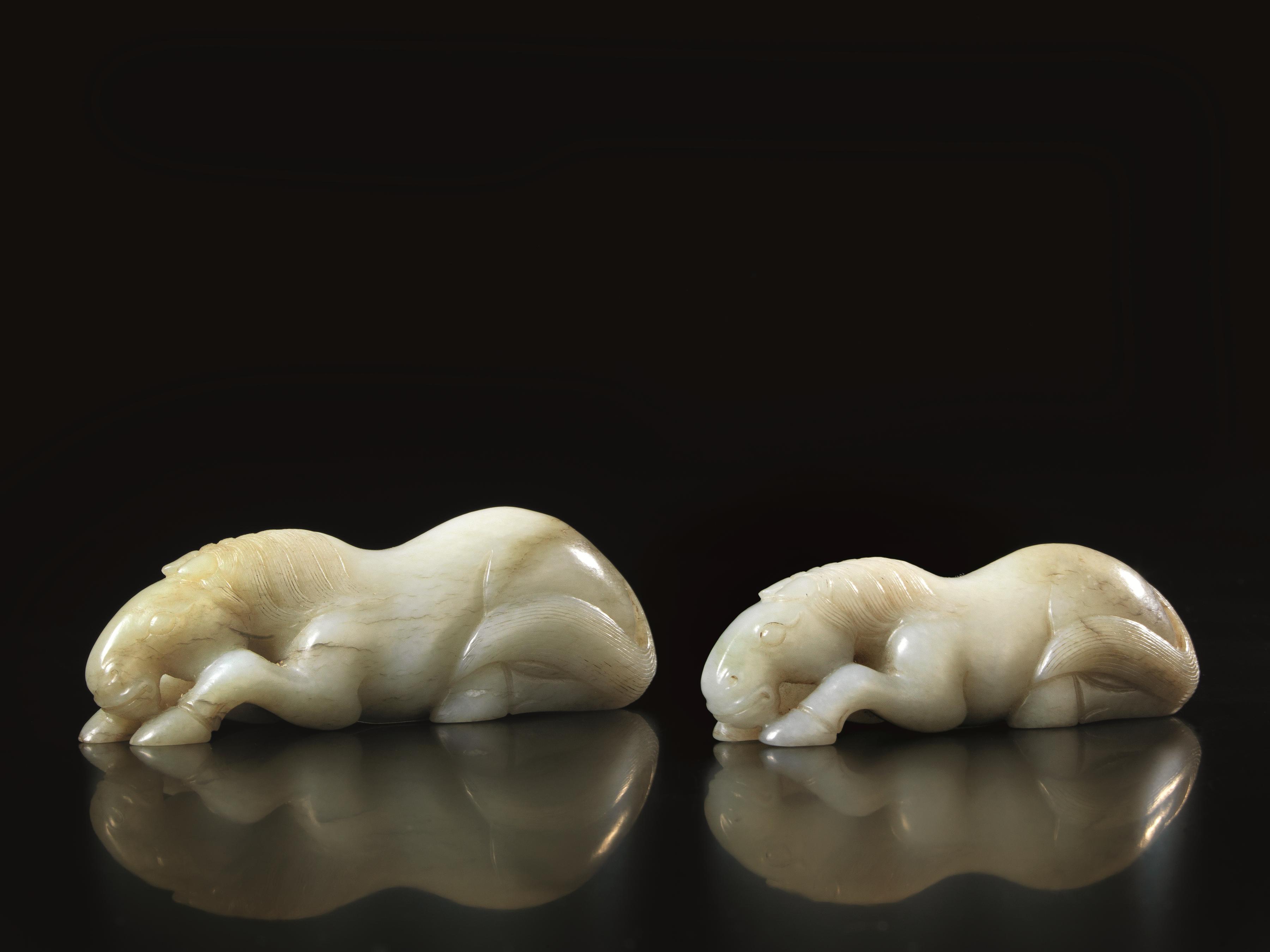 in giada celadon, modellati nella forma di cavalli accucciati, lung. cm 9 e cm 8 (2)