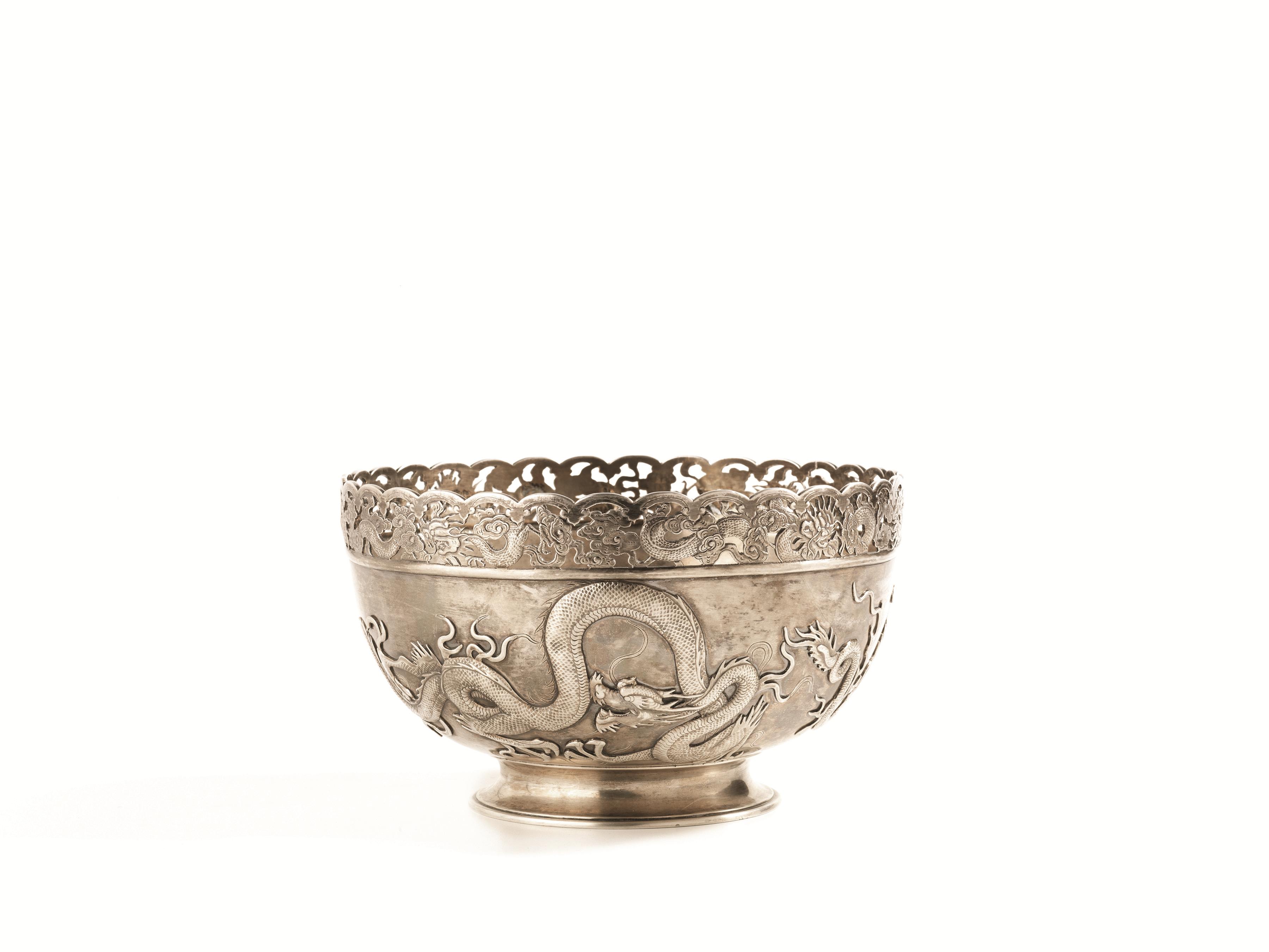 in argento finemente cesellato, con motivi di draghi che si rincorrono e il bordo lavorato al traforo, diam. cm 21, g. 836