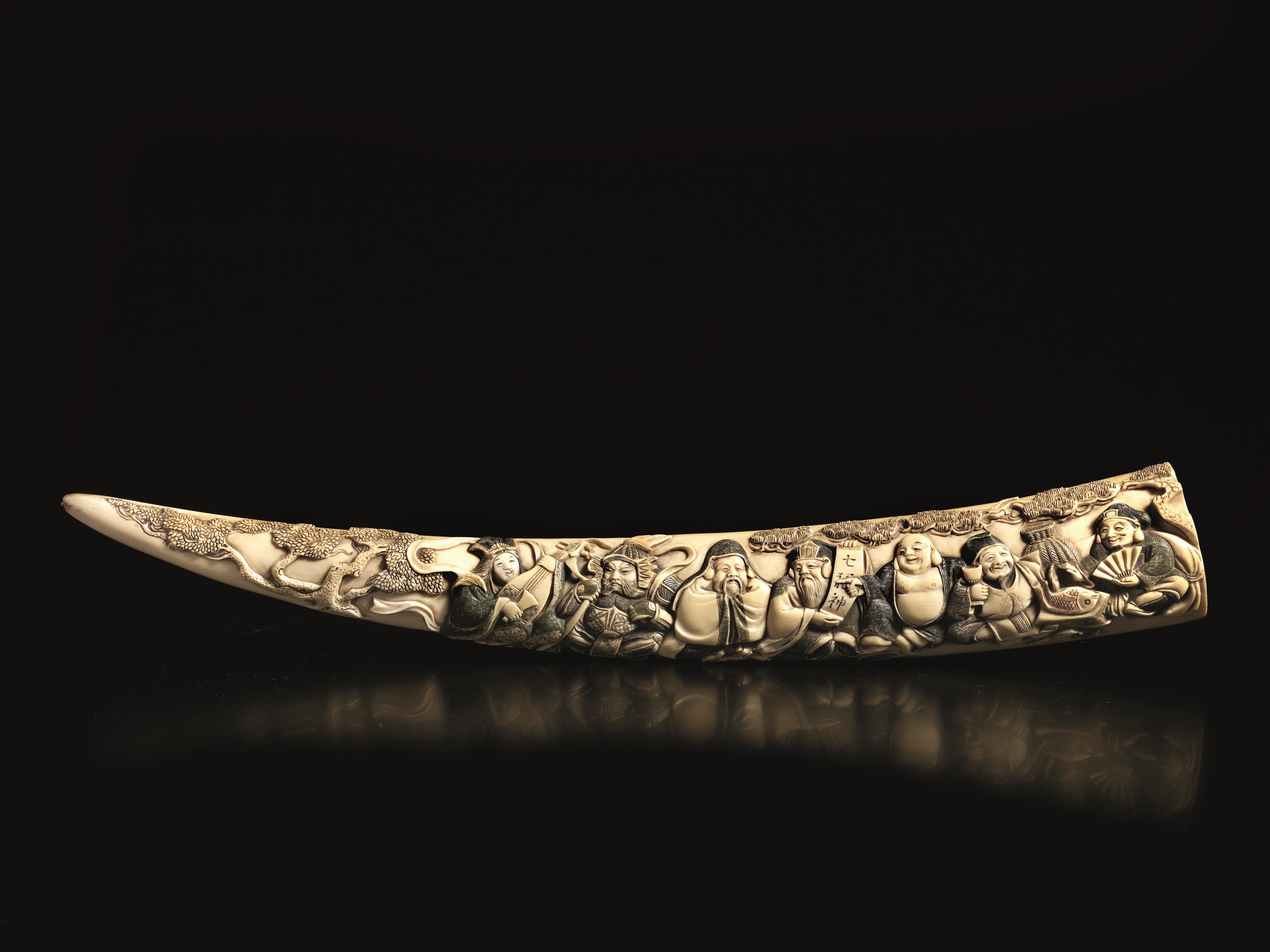 in avorio, intagliato con figure di saggi, lung. cm 49