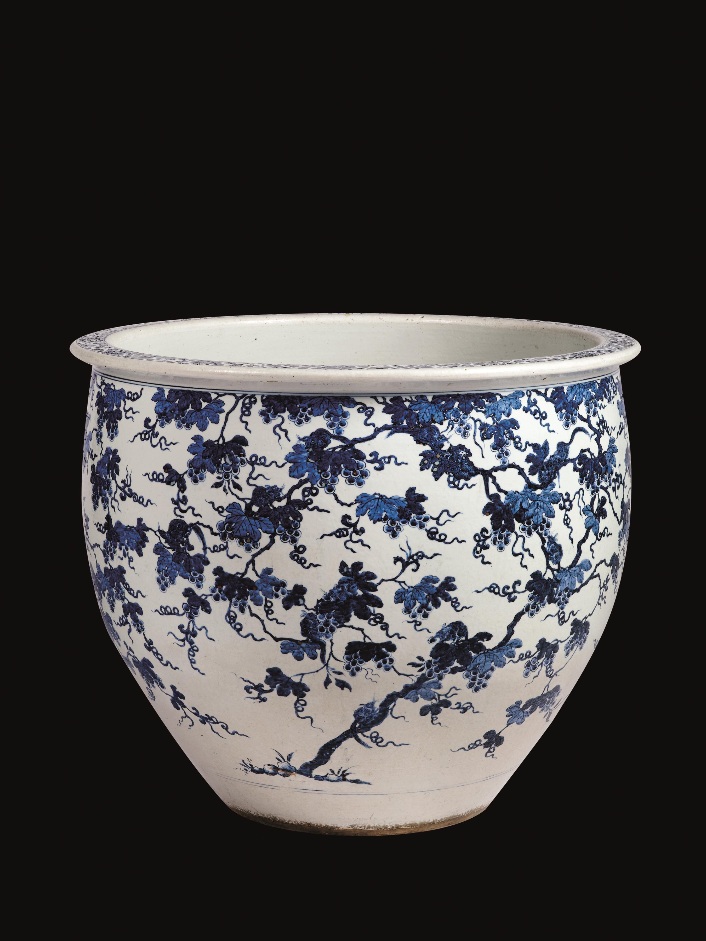 A large blue and white squirrel and grape-vine fish bowl, China, late Qing dynasty, 19th century, h. 53 cm, diam. 63,5 cm