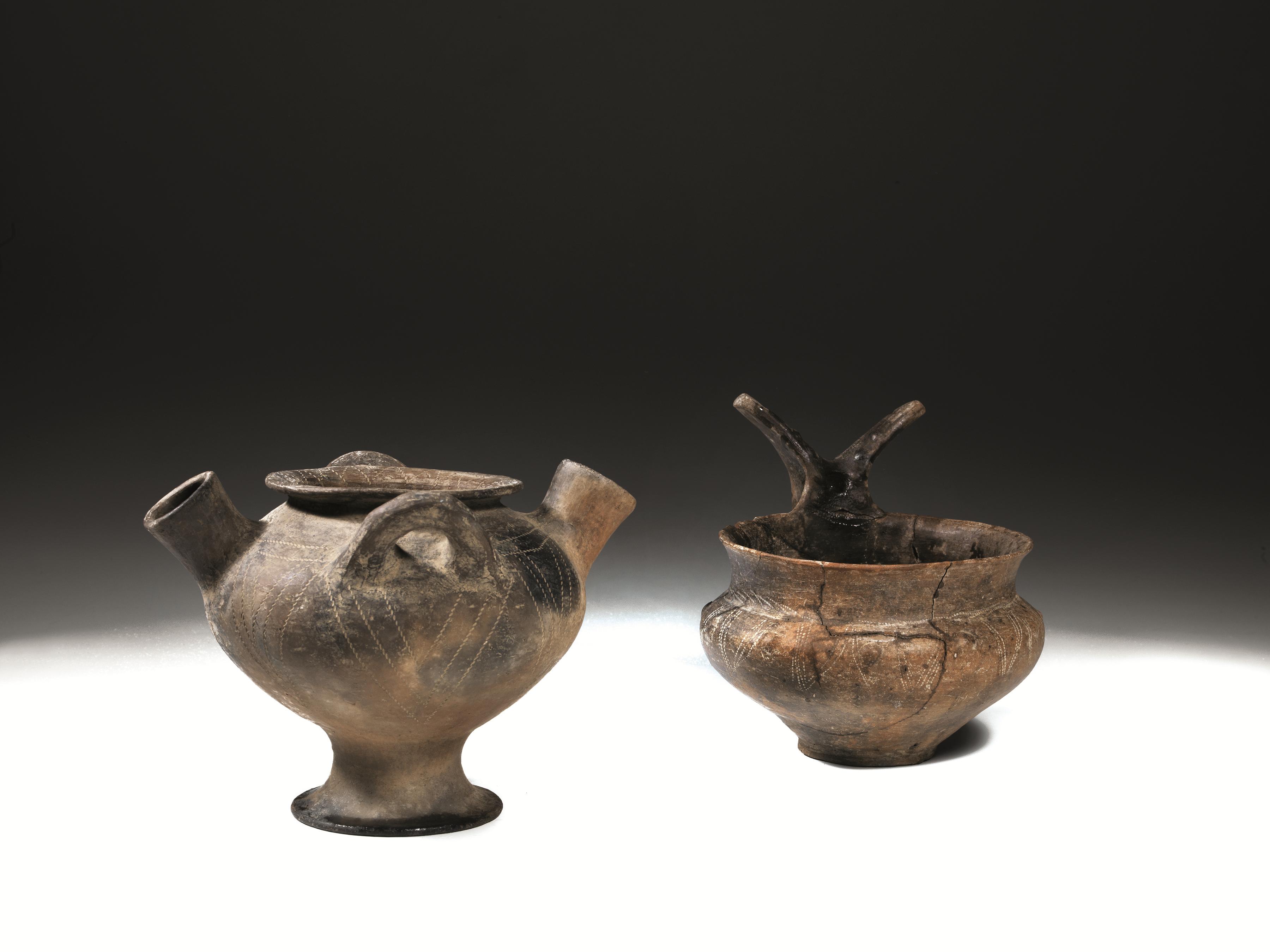 Una grande tazza con orlo leggermente estroflesso, collo cilindrico, impostato sulla vasca troncoconica mediante una carena, piede a disco, ansa a nastro insellata e sormontante impostata sull’orlo e sulla carena, decorata sulla spalla a falsa cordicella con triangoli col vertice rivolto verso il basso alternati ad apofisi coniche, ricomposta da frammenti; olletta biansata, con orlo estroflesso e appiattito, corpo globulare schiacciato ai poli, alto piede a tromba, anse a nastro impostate obliquamente sulla spalla e alternate a due beccucci cilindrici; decorata a falsa cordicella sul labbro e sul ventre con linee orizzontali e triangoli col vertice verso il basso, integra ad eccezione di un frammento del labbro ricomposto (2)