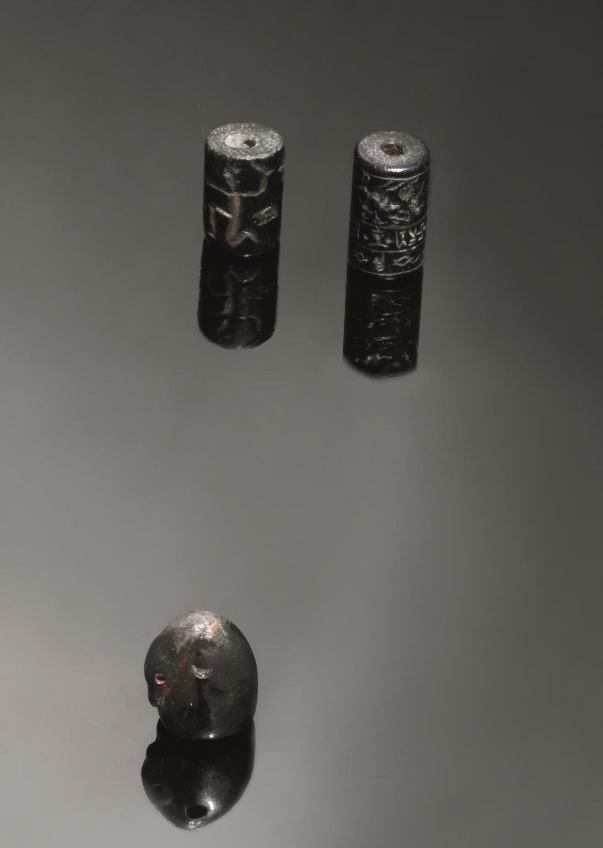 Due sigilli cilindrici di cui uno inciso su tre registri con teoria di figure animali e umane in basso e due linee di animali e iscrizioni, l’altro con figura umana e animale fantastico e uno di forma conica con testa d’oca ripiegata su un lato, foro passante per la sospensione, inciso sulla faccia inferiore con divinità assisa in trono (3)