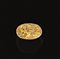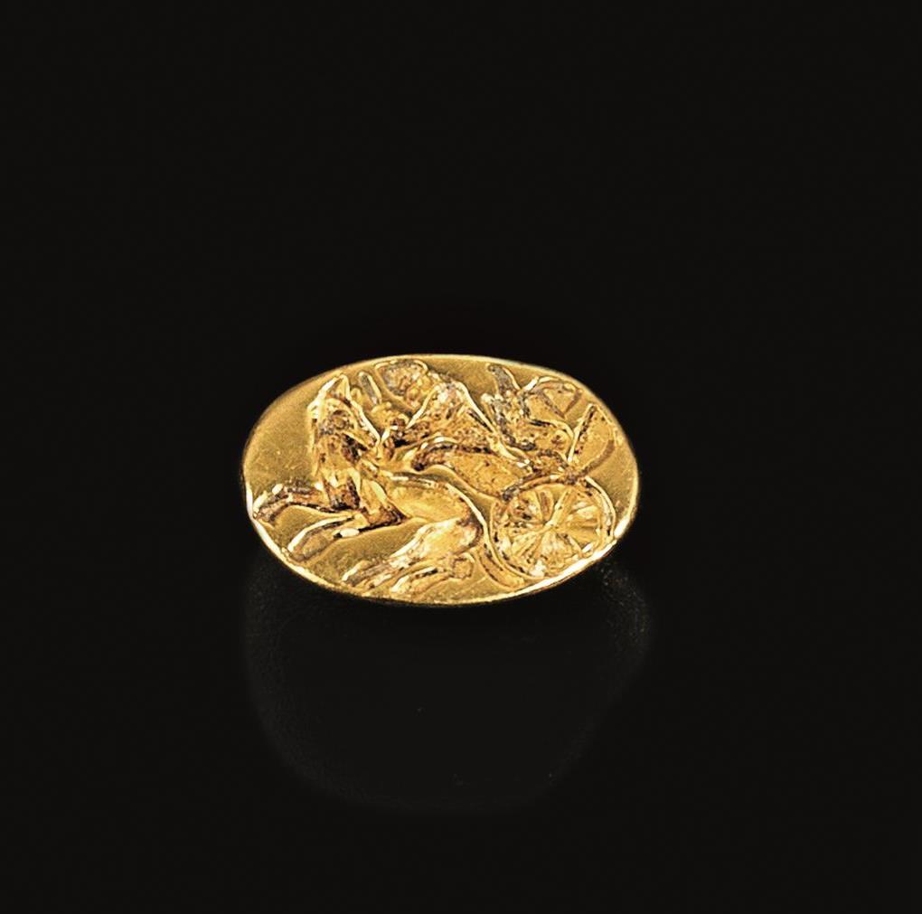 Anello in oro a fusione piena con castone ovale inciso con biga lanciata al galoppo guidata da un auriga elmato mentre davanti un guerriero brandisce la spada