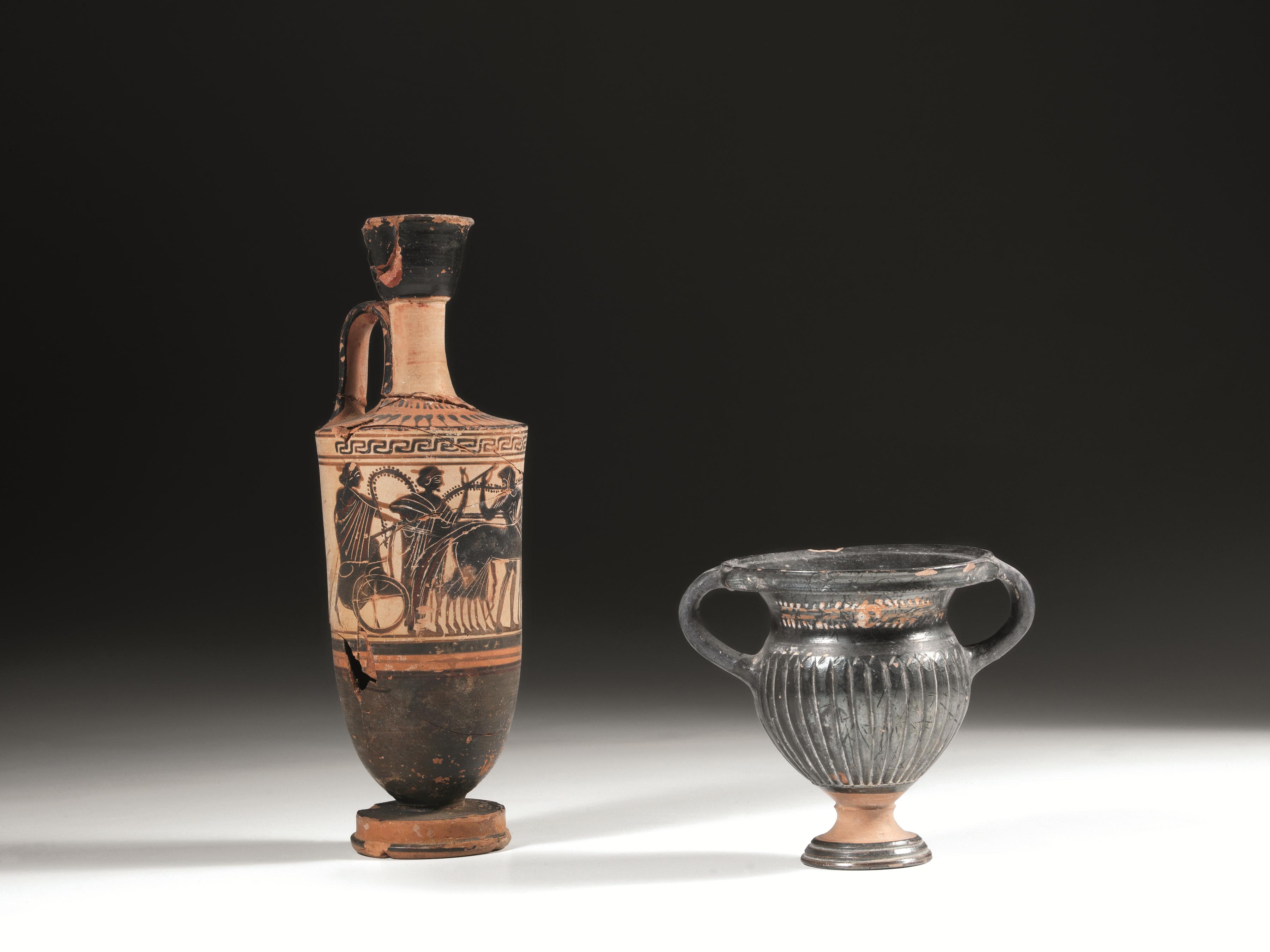 LEKYTHOS ATTICA A FIGURE NERE E KANTHAROS Materia e tecnica: argilla figulina...