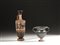 Lekythos con bocchello di forma troncoconica rovescia, collo sottile cilindrico a profilo concavo, indistinto dalla spalla obliqua, corpo troncoconico; ansa a nastro impostata verticalmente dal collo alla spalla, piede a disco modanato; kantharos con orlo estroflesso collo cilindrico a profilo concavo, corpo ovoide, piede a tromba modanato, anse a doppio bastoncello impostate orizzontalmente dall’orlo alla spalla decorato sul collo con tralcio vegetale, corpo baccellato (2)