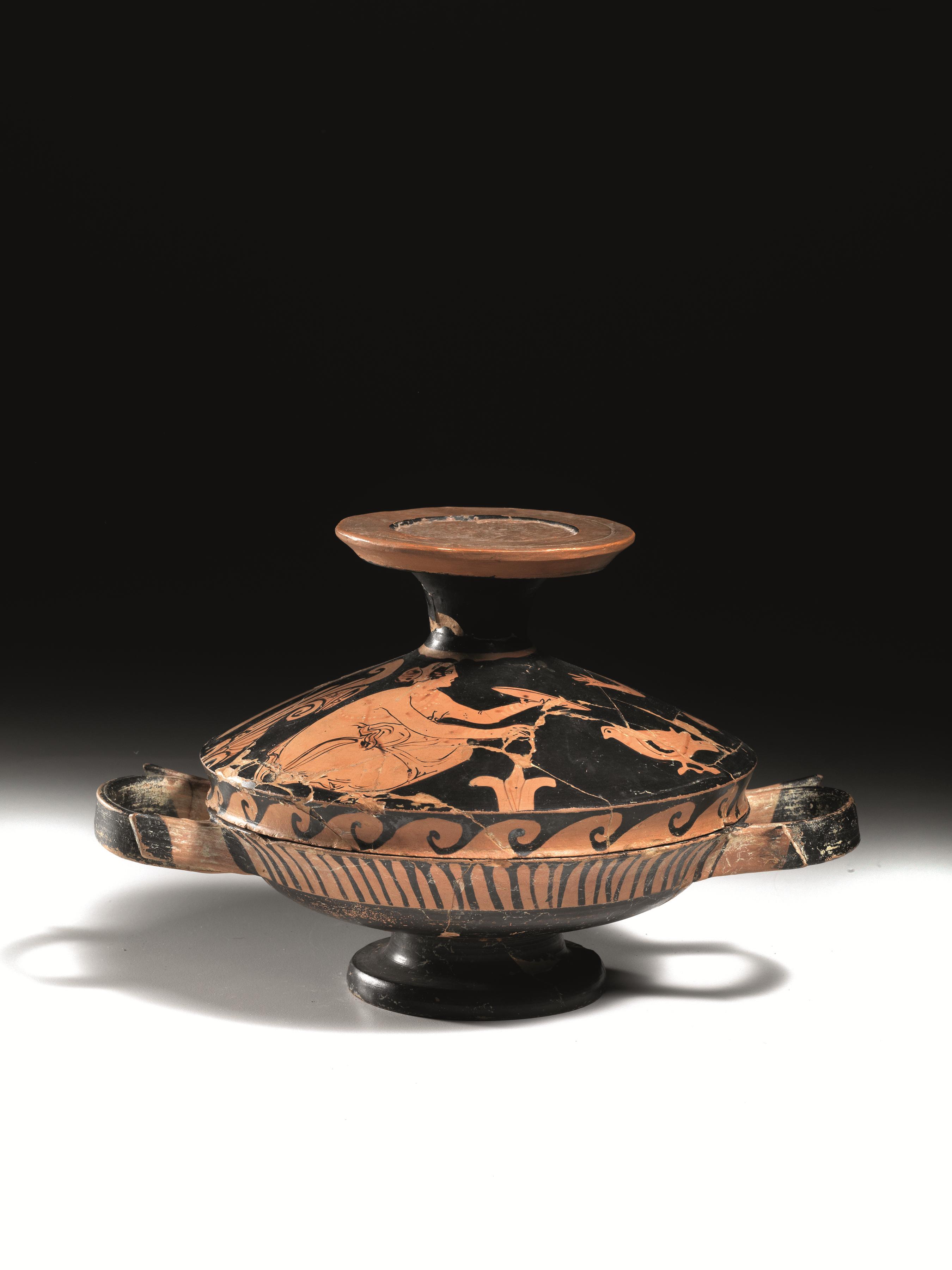 Decorazione: coppa: anse parzialmente verniciate, orlo con trattini verticali, parte inferiore della vasca e piano di appoggio del piede verniciati; coperchio: sulla spalla è campita un’unica scena con una figura di donna a busto nudo e con veste drappeggiata sulle gambe, stante accosciata a destra in atto di sostenere nella sinistra una grande phiale con offerte verso un grande erote androgino, alato e nudo in volo verso sinistra, con kekryphalos su i capelli e calzari ai piedi. Nel campo riempitivi a palmetta ed una colomba orlo con meandro a onde verso destra.