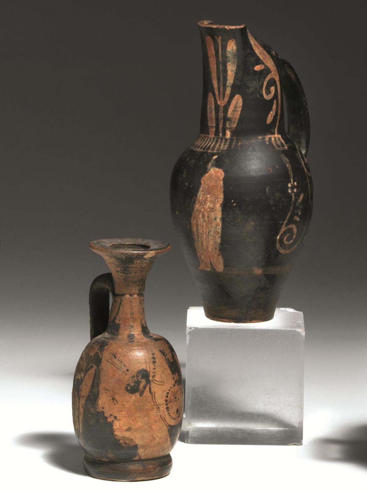 Lotto 75 | OINOCHOE A CARTOCCIO E PICCOLA LEKYTHOS Materia e tecnica: argilla figulina...