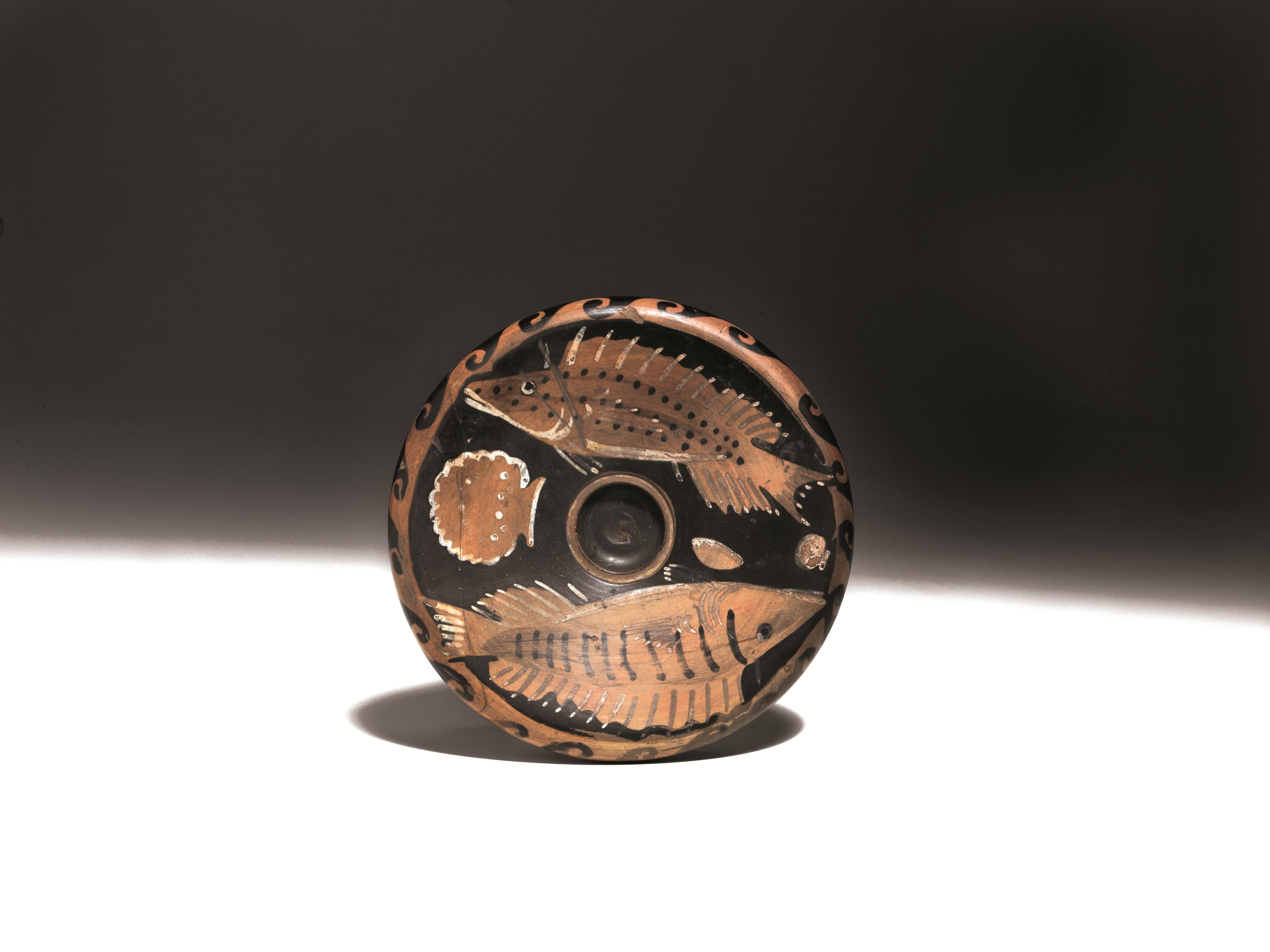 Decorazione: sul bordo meandro ad onda destrorso, nella vasca due grandi pesci alternati a conchiglie