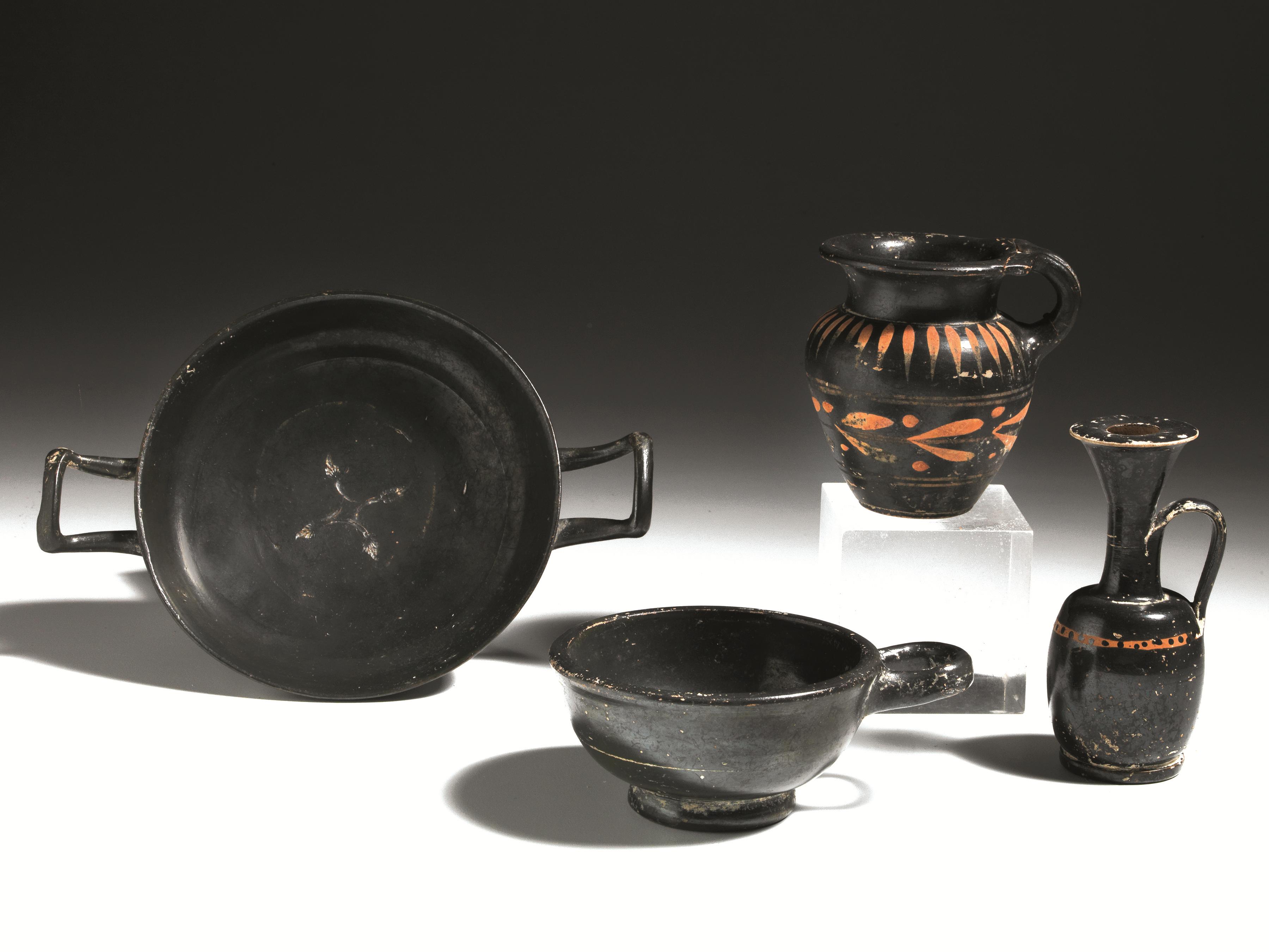 Kylix con vasca poco profonda decorata al centro con catena di quattro palmette, piede ad echino e anse a bastoncello ritorte verso l’alto; coppetta monoansata con vasca troncoconica, piede troncoconico ansa a nastro obliqua; brocchetta con labbro appiattito, collo cilindrico, corpo ovoide, piede a disco, ansa a nastro costolata, decorata con linguette e tralcio di olivo; piccola lekythos con bocchello ad echino, collo cilindrico, corpo ovoide, piede ad anello, ansa a nastro, decorata con fila di puntini (4)