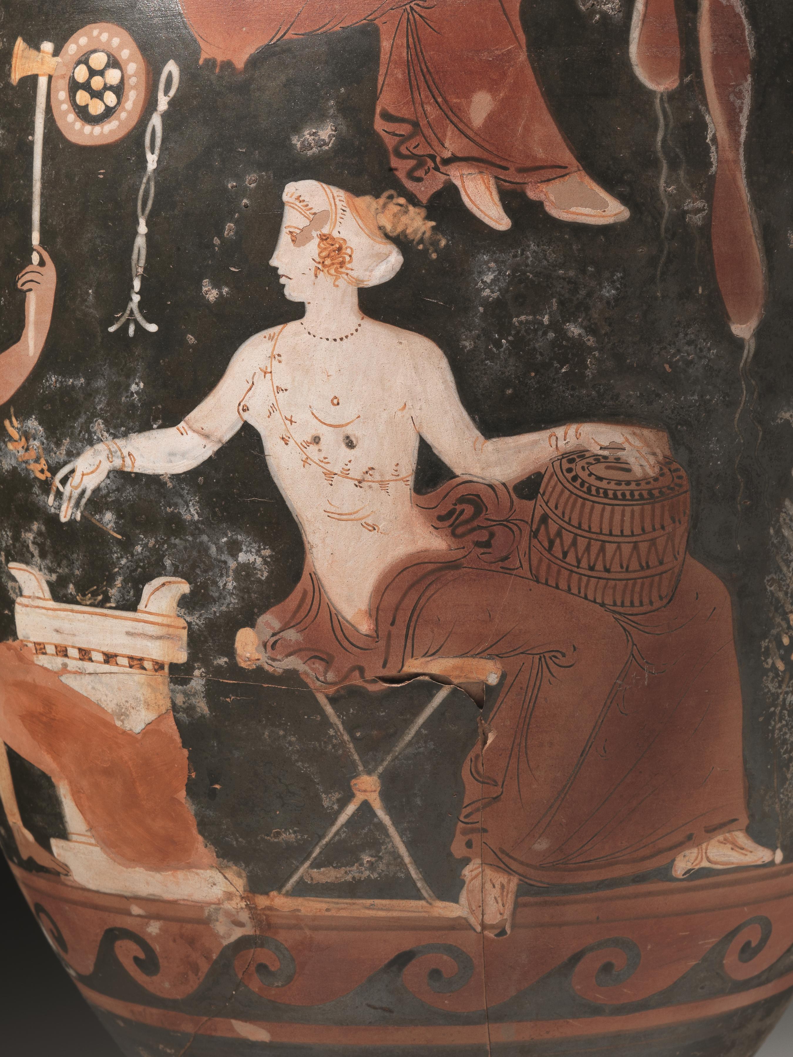 Decorazione: scena di sacrificio presso un altare situato al centro, un giovane stante volto a sinistra con elmo piumato, corazza e schinieri, nella mano sinistra un’ascia bipenne, la destra appoggiata ad un grande scudo circolare in prospettiva posizionato sopra un capitello; di fronte a lui una giovane donna nuda seduta su uno sgabello pieghevole, volta verso sinistra e retrospiciente, l’ himation drappeggiato sulle gambe con kekryphalos ricamato ed una ricca parure composta da una piccola collana di perle e da un filo d’oro con pendenti a bandoliera sul torace, armille ai polsi e un diadema. La fanciulla è in atto di offrire sull’altare un ramoscello che tiene nella mano destra mentre la sinistra si appoggia su una grande cista decorata che tiene in grembo; su un registro superiore è raffigurata una nike in volo con le ali distese mentre porge un ramoscello al guerriero; la figura indossa un lungo chitone plissettato fermato in vita da un nastro. Nel campo riempitivi fitomorfi indicano che la scena si svolge all’esterno