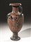 Orlo a tesa appiattita con labbro pendulo obliquo, collo cilindrico a profilo concavo, a raccordo fluido con la spalla appiattita, corpo ovoide rastremato inferiormente, piede campanulato, ansa posteriore a bastoncello, impostata dall’orlo alla spalla, anse laterali a bastoncello ritorte verso l’alto ed impostate obliquamente sul ventre
