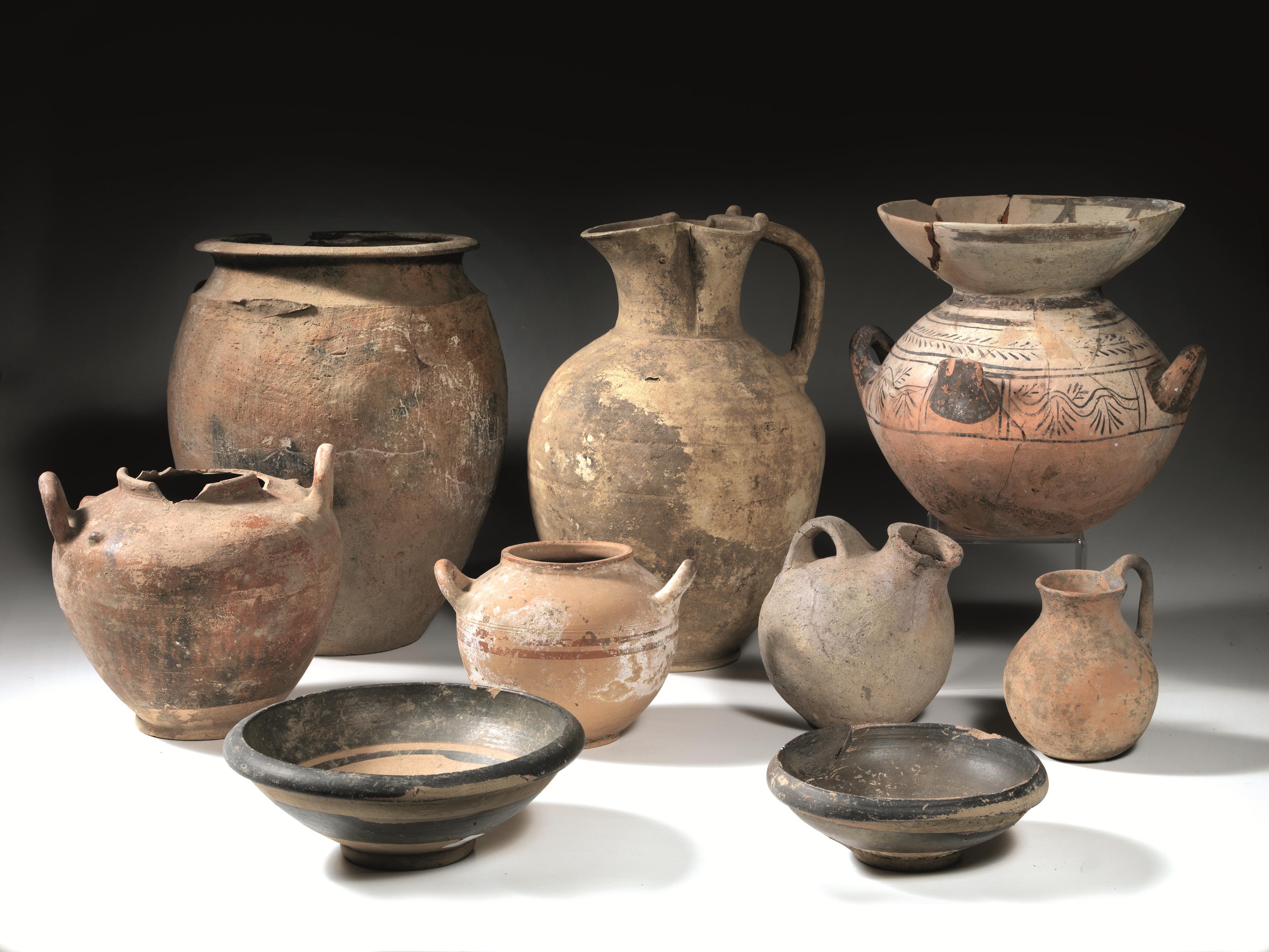 Olla con orlo ad imbuto , corpo globulare schiacciato ai poli, anse a bastoncello, impostate obliquamente sulla massima espansione, alternate a protomi quadrangolari, decorata con fasce orizzontali alternate a motivi fitormorfi stilizzati, ricomposta da frammenti; grande oinochoe a bocca trilobata in ceramica acroma con piccole apicature all’attacco dell’ansa, corpo piriforme, piede a disco, ansa a nastro verticale bocca ricomposta da frammenti; una grande olla con orlo appiattito, corpo ovoide e fondo piatto con quattro piccole anse a presa sulla massima espansione con una lacuna sul labbro; due piccoli stamnoi in ceramica a fasce con orlo a colletto, corpo ovoide schiacciato, piede a disco e anse a bastoncello oblique decorati con fasce in bruno, uno integro, l’altro con bocca lacunosa; una brocchetta in ceramica acroma con orlo circolare e corpo piriforme, fondo piatto ed un piccolo askos in ceramica acroma con corpo globulare entrambi ricomposti da frammenti; due coppe in ceramica a fasce con orlo obliquo, vasca troncononica, piede ad anello, una integra, l’altra con un restauro sul labbro (9)