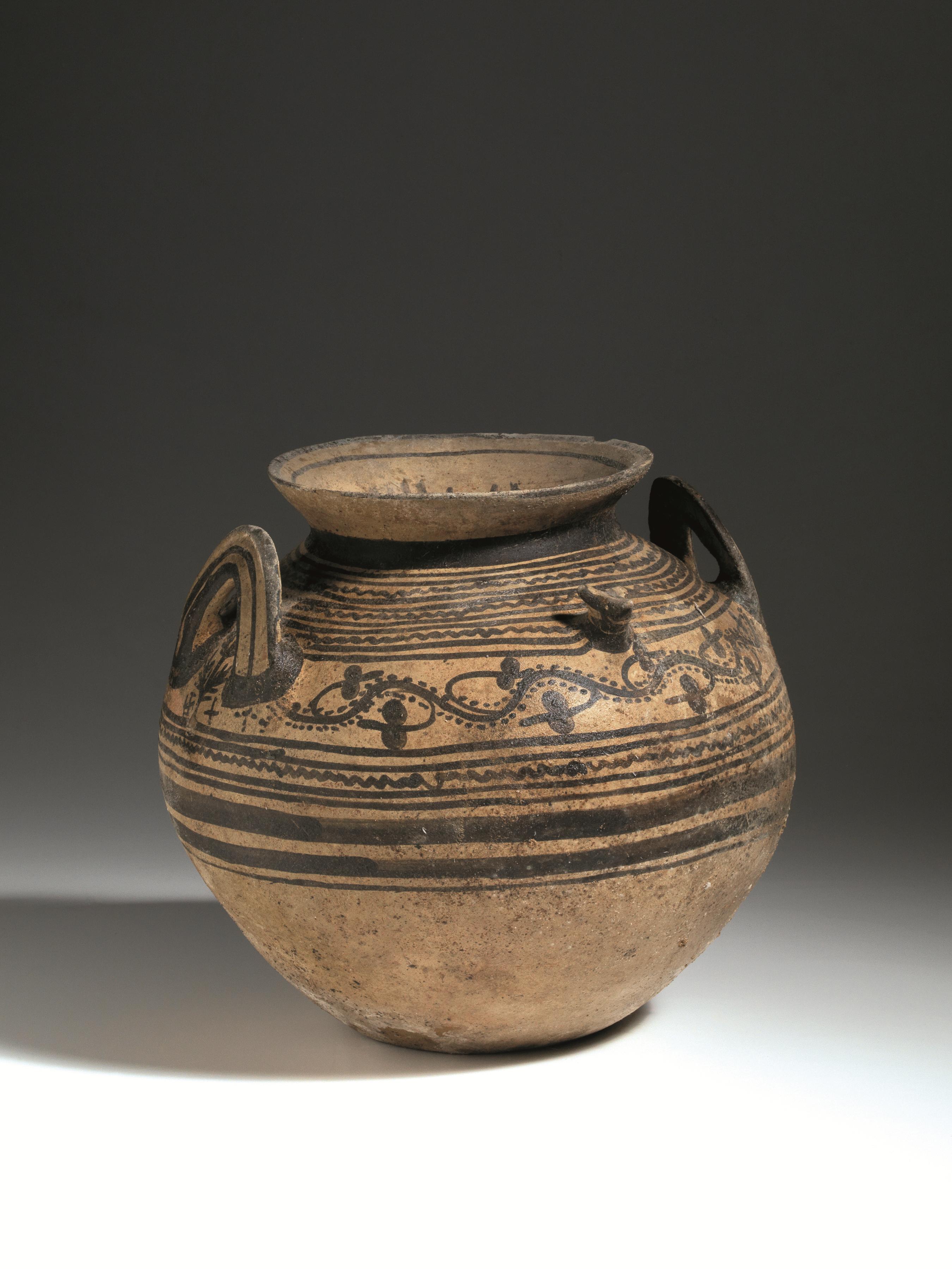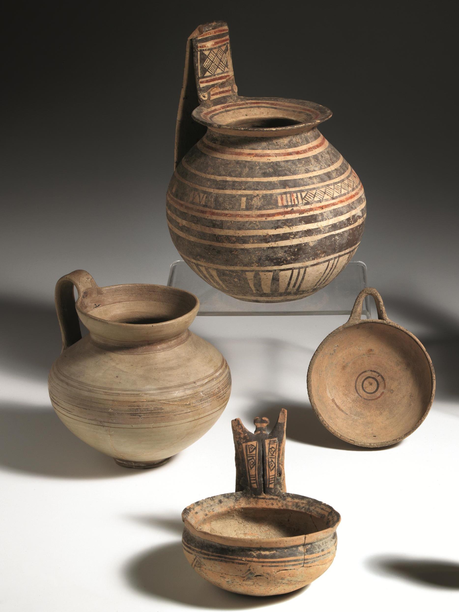 Olla con orlo a imbuto, corpo globulare schiacciato ai poli, fondo piatto, decorata a motivi geometrici e fitomorfi con tralci di foglie d’edera, anse a ferro di cavallo impostate verticalmente sulla spalla e alternate a protomi animali; brocca con labbro orizzontale, corpo ovoide, fondo piatto, ansa a nastro sormontante e ripiegata decorata con bande alternate in bruno e rosso che campiscono fasce con motivi geometrici; attingitoio con labbro svasato, vasca emisferica, ansa a nastro sormontante e cornuta decorato a motivi geometrici; brocchetta con labbro svasato, corpo lenticolare e fondo piatto decorata a fasce e coppetta monoansata con vasca troncoconica (5)