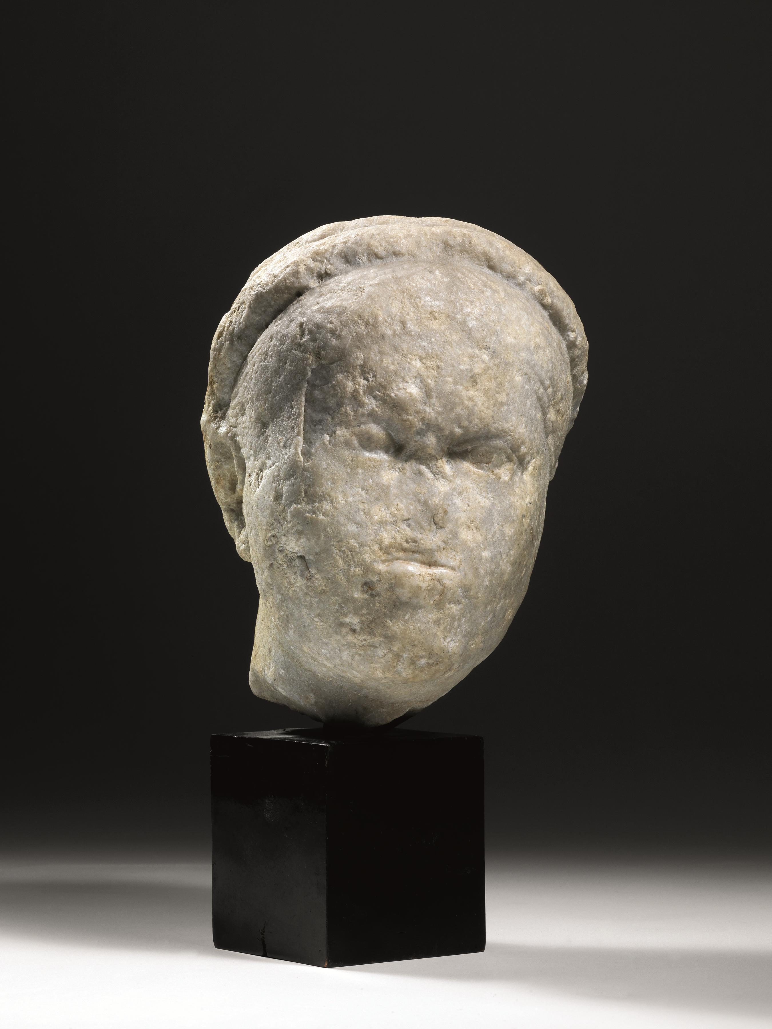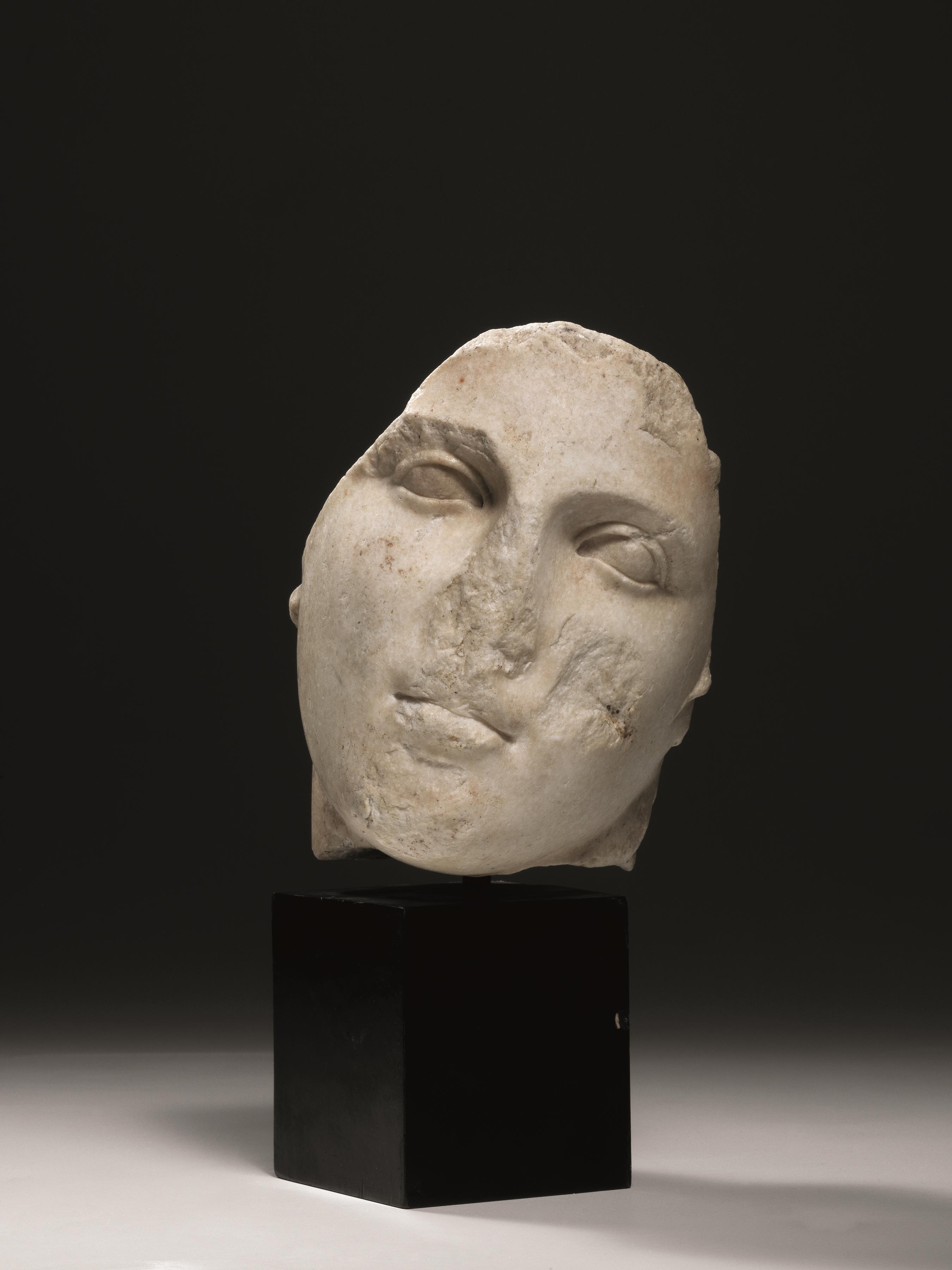Stato di conservazione: si conserva solo il volto e l’attacco del collo, naso frammentario, scheggiature diffuse